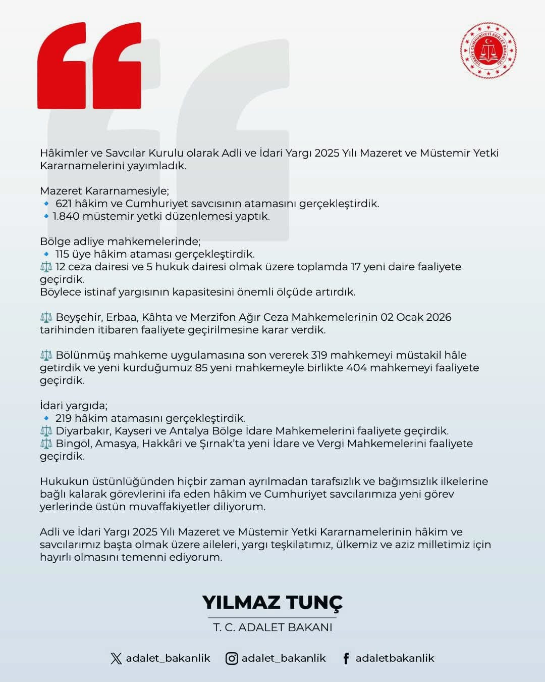 Adalet Bakanı Yılmaz Tunç, Hakimler ve Savcılar Kurulu (HSK) tarafından hazırlanan Adli ve İdari Yargı 2025 Yılı Kararnameleri'nin yayımlandığını duyurdu. Kararname, yargı teşkilatının yapısını güçlendiren önemli adımları içeriyor.