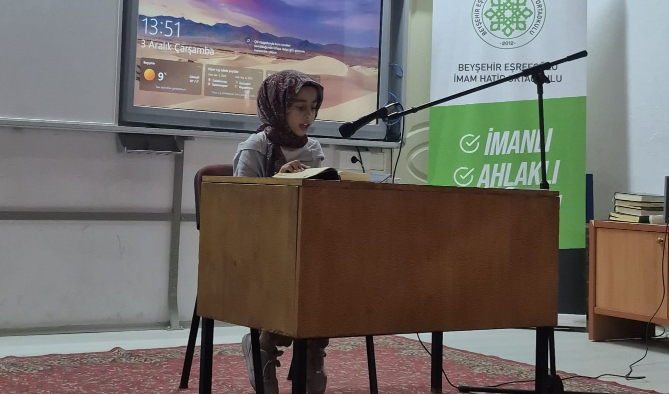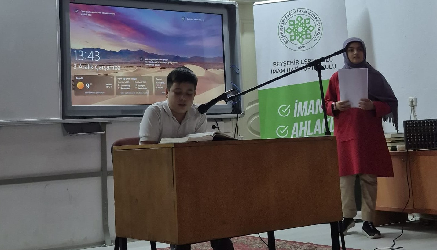 Beyşehir Eşrefoğlu İmam Hatip Ortaokulu’nda, okulun konferans salonunda gerçekleştirilen Genç Sada (erkek öğrenciler) ve Genç Nida (kız öğrenciler) Kur’an-ı Kerim’i Güzel Okuma Yarışmaları, yoğun ilgi ve yüksek manevi atmosferle tamamlandı.