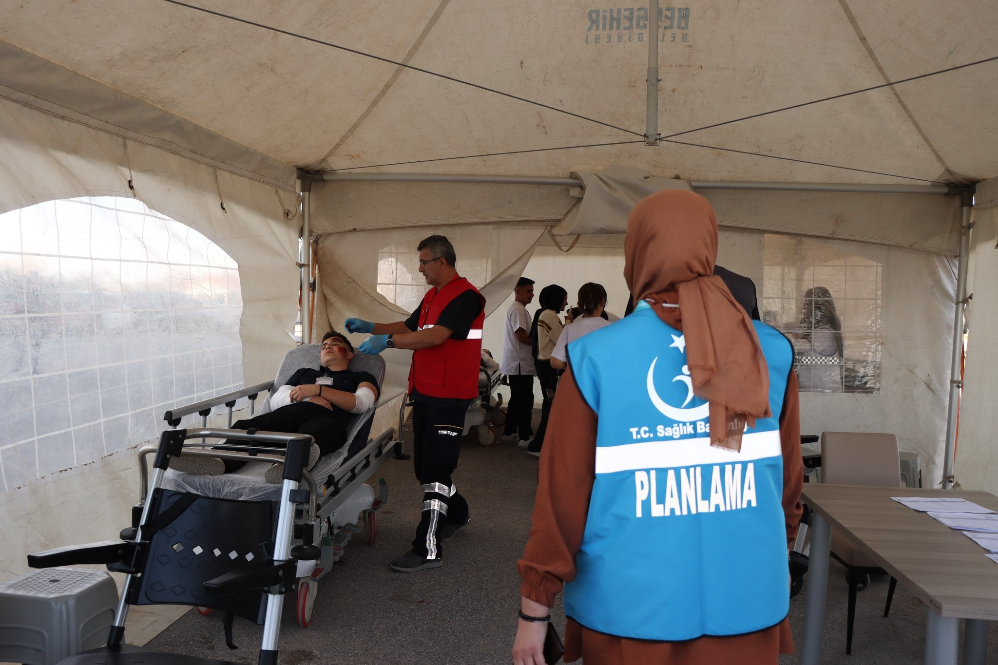 Senaryo gereği yaralı olarak hastaneye getirilen yaralıların ilk müdahaleleri yapıldı.