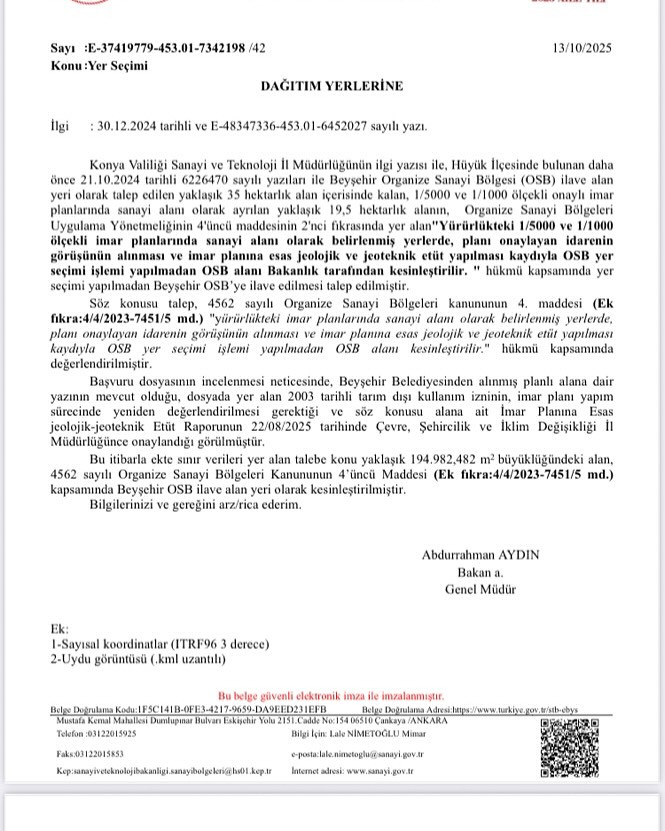 Hüyük Belediye Başkanı Sadık Sefer, konu ile ilgili olarak Hüyük Belediyesine de gelen bakanlık onay yazısını sosyal medya hesabından paylaşarak, “Organize sanayimiz Bakanlığımızda onaylandı. İlçeme hayırlı olsun” cümleleriyle müjdesini kamuoyuna duyurdu.