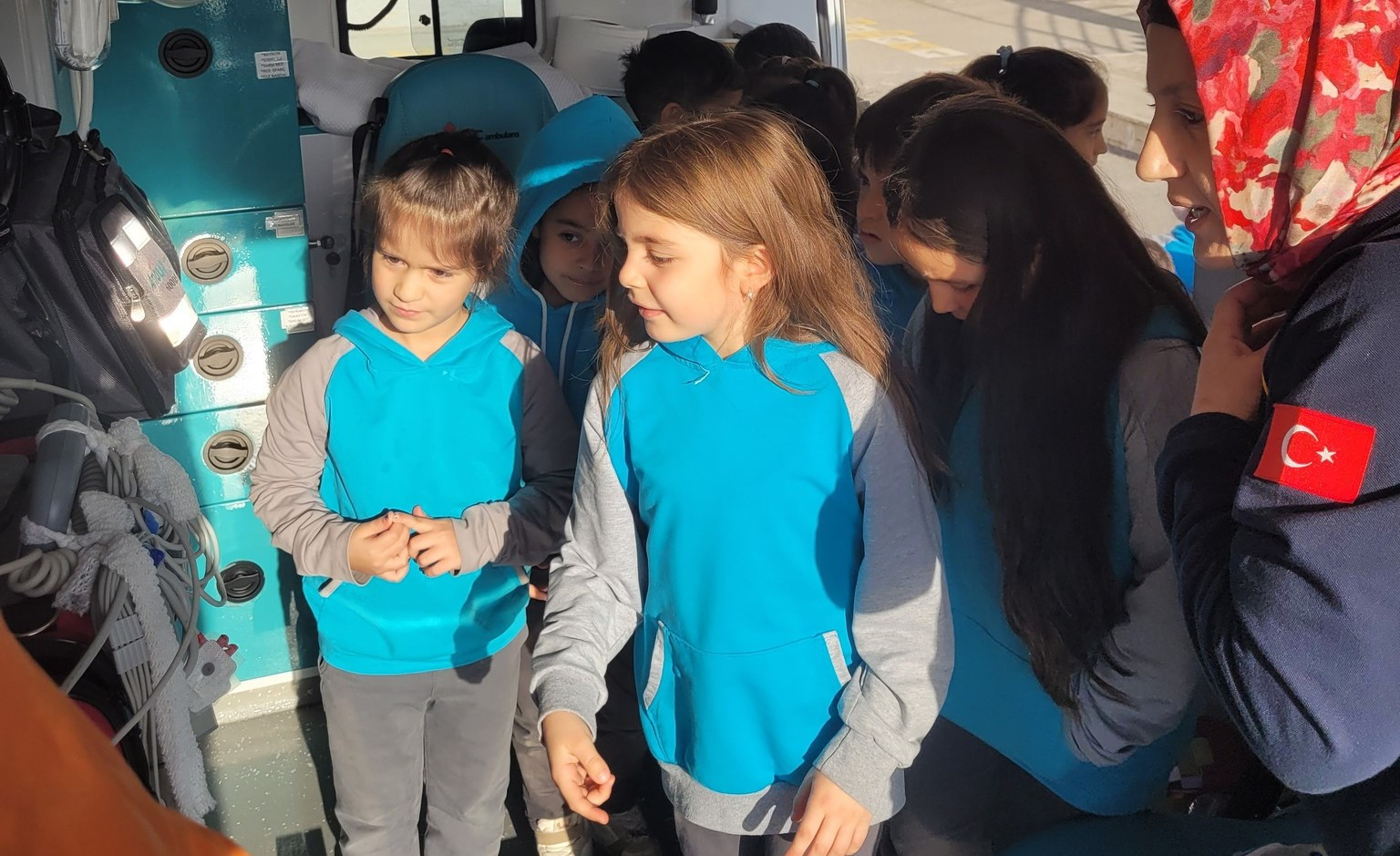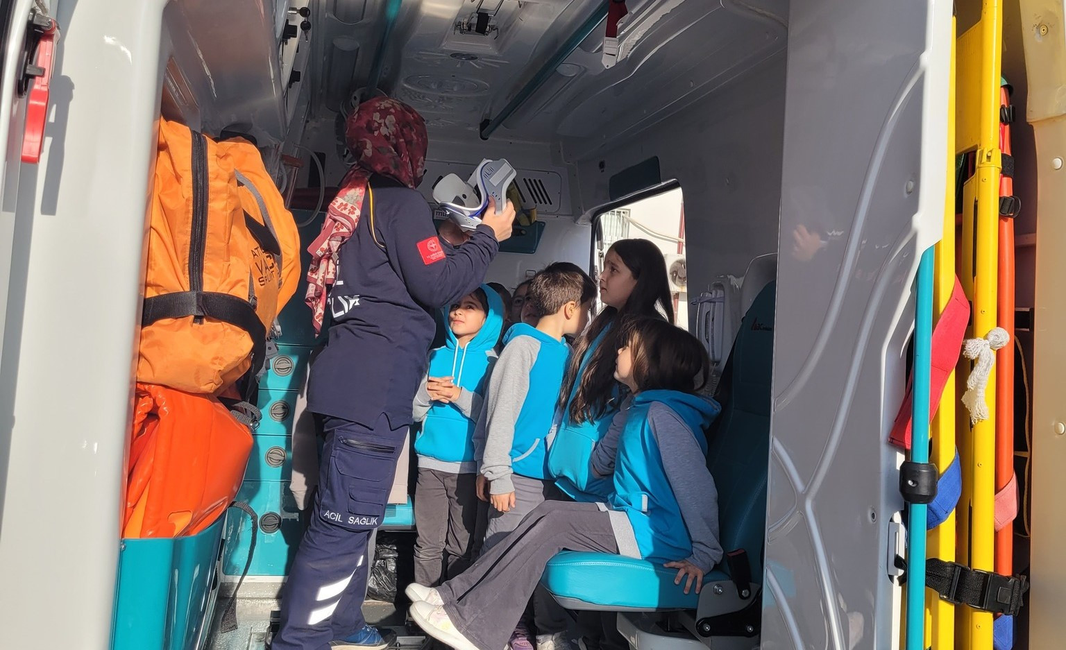 Karşılarında gerçek bir ambulans ile sağlık çalışanlarını gören öğrenciler büyük bir heyecan yaşadı. Ambulansın içine giren, cihazları yakından inceleyen ve hasta taşıma sedyesine yatarak deneyimleyen minikler, keyifli anlar yaşadı.