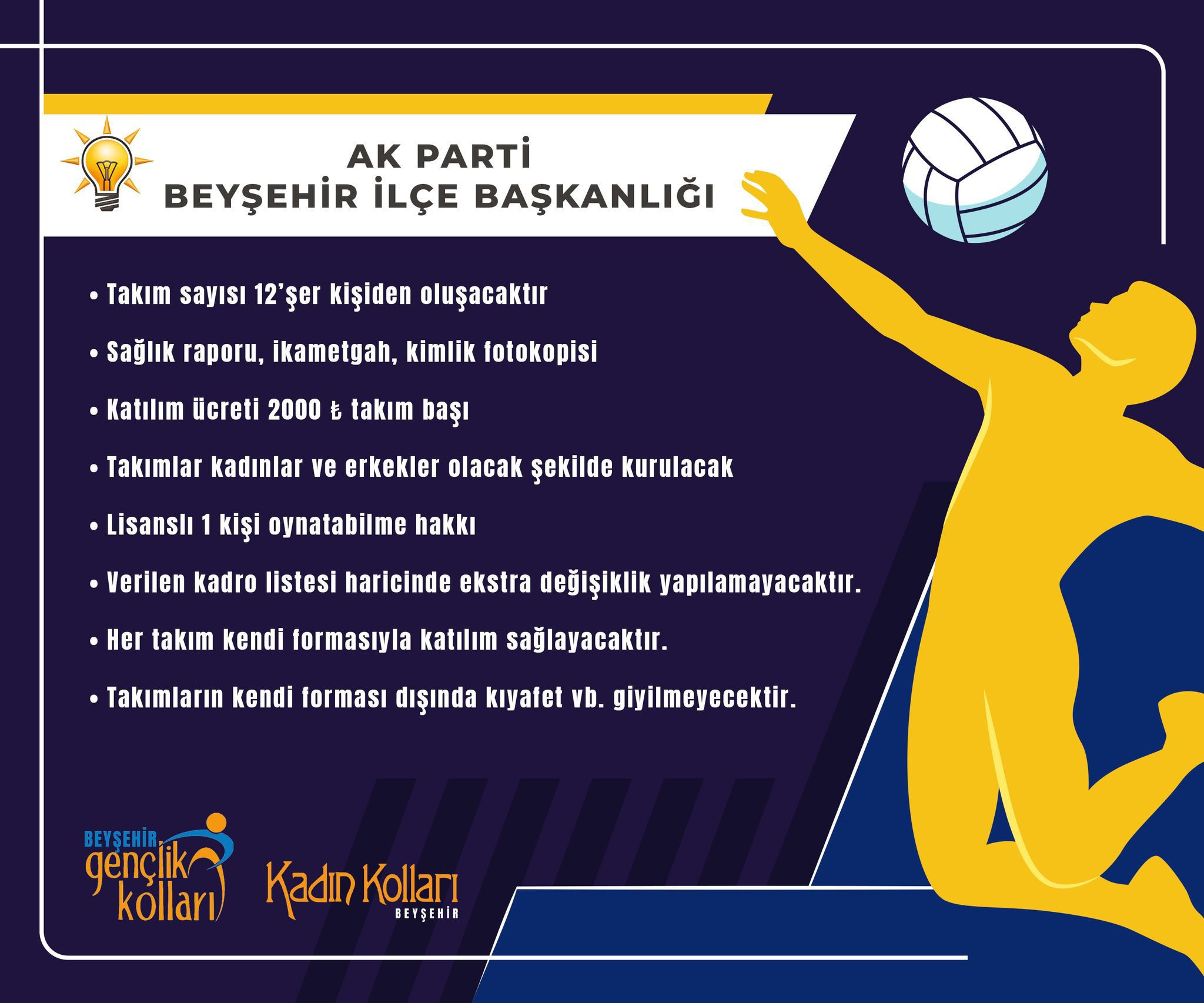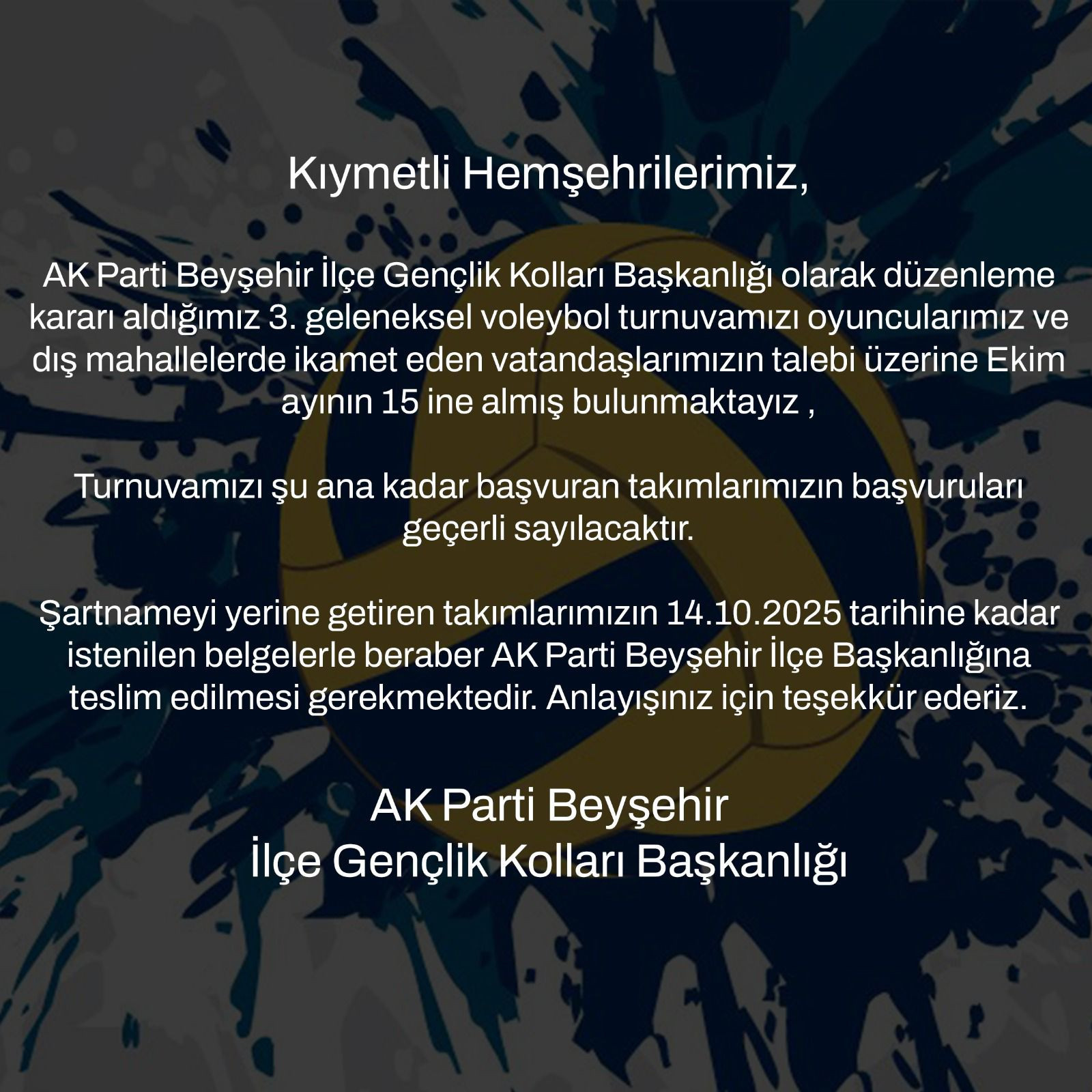 AK Parti Beyşehir Gençlik Kolları Başkanlığından yapılan yazılı açıklamada, düzenlenen turnuva için başvuruda artık geriye sayımın başladığı belirtilerek, “AK Parti Beyşehir İlçe Gençlik Kolları Başkanlığı olarak düzenleme kararı aldığımız 3.geleneksel voleybol turnuvamızı oyuncularımız ve dış mahallelerde ikamet eden vatandaşlarımızın talebi üzerine Ekim ayının 15’ine almış bulunmaktayız.
