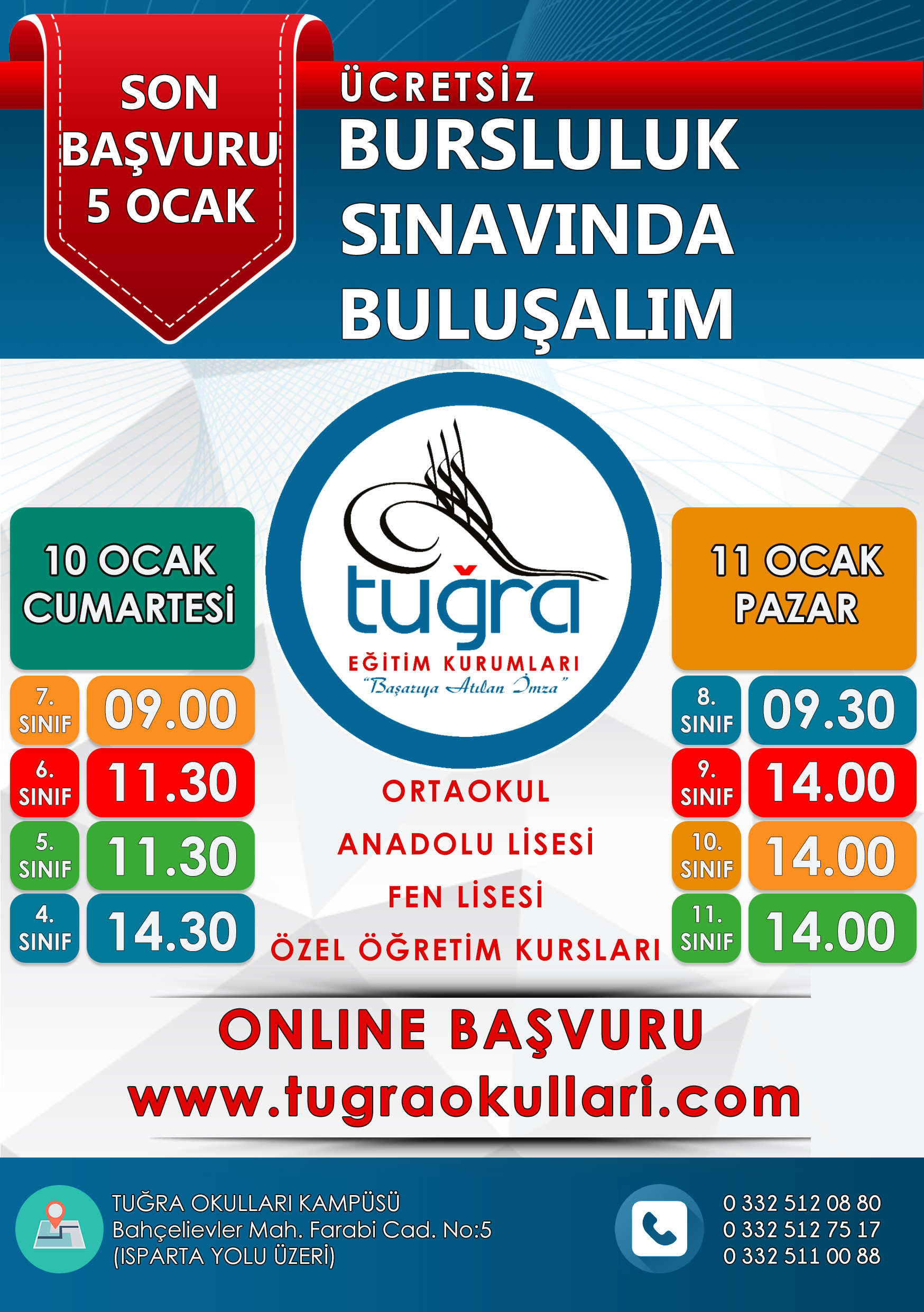 Sınav, Tuğra Okulları Kampüsünde gerçekleştirilecek olup 4, 5, 6, 7, 8, 9, 10 ve 11. sınıf öğrencilerinin katılımına açıktır. Bursluluk sınavına başvuru için herhangi bir şart aranmamaktadır.
