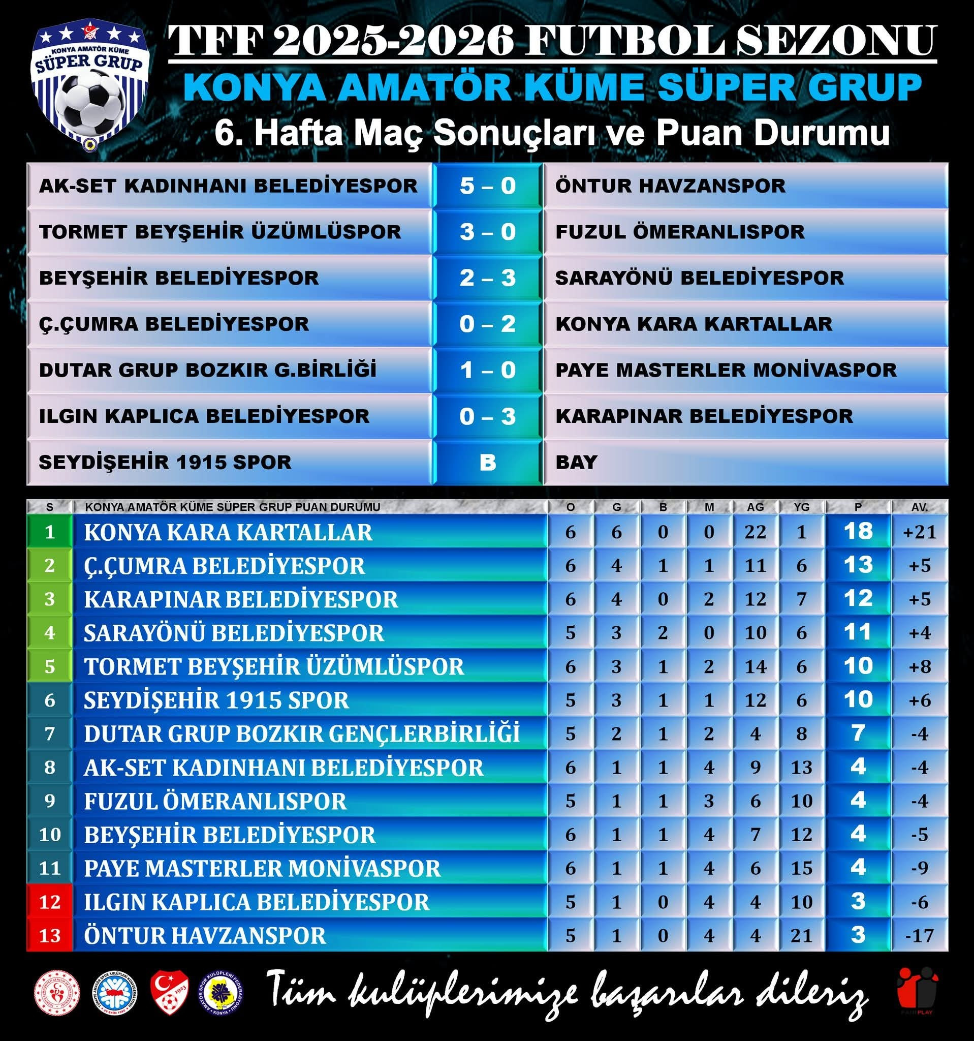 Konya Kara Kartallarspor’un liderliğini sürdürdüğü Süper Grupta hafta sonu oynanan diğer karşılaşmalarda şu sonuçlar alındı: