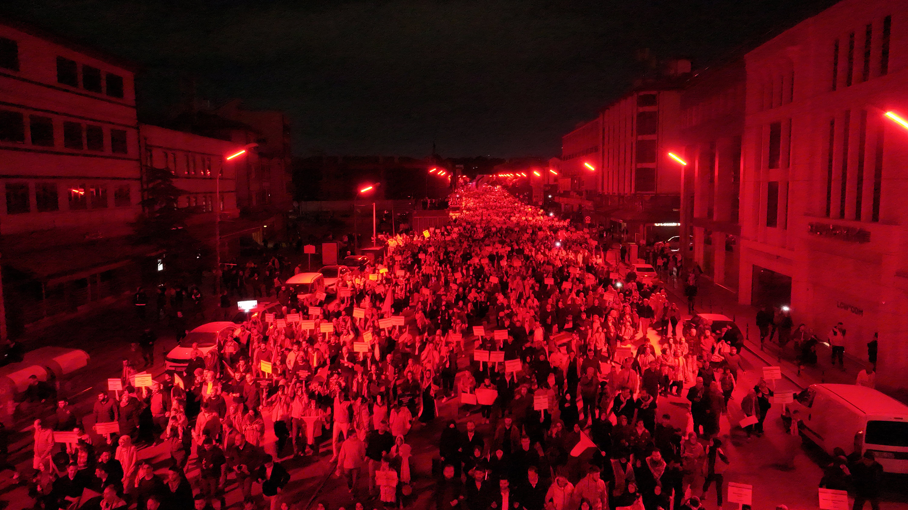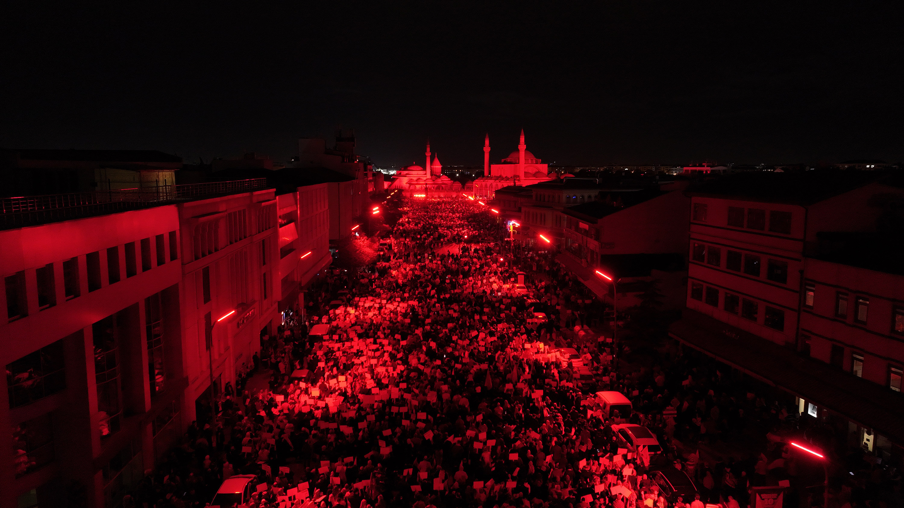 Yürüyüş boyunca yüksek sesle savaş sesleri simüle edilerek katılımcılar, Gazze halkının yaşadığı korku ve çaresizliği daha derinden hissetti. Ayrıca şehrin kalbi sayılan yürüyüş güzergâhında sokak aydınlatmaları kapatıldı; Taş Bina, Alâeddin Camii, Darülmülk Müzesi, Mevlana Türbesi ve cadde üzerindeki yapılar kırmızı ışıklarla aydınlatılarak Filistin’deki zulüm görsel bir hafızaya dönüştürüldü.