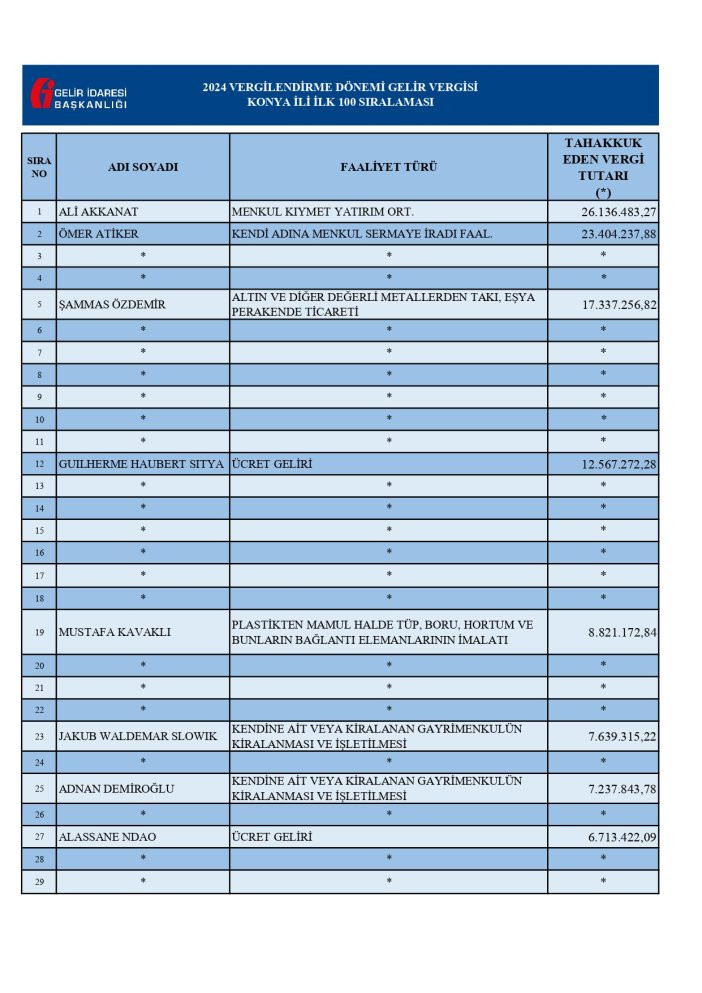 Konya Vergi Dairesi Başkanlığı, 2024 yılı vergilendirme dönemine ait gelir ve kurumlar vergisi rekortmenleri listesini kamuoyuyla paylaştı.
