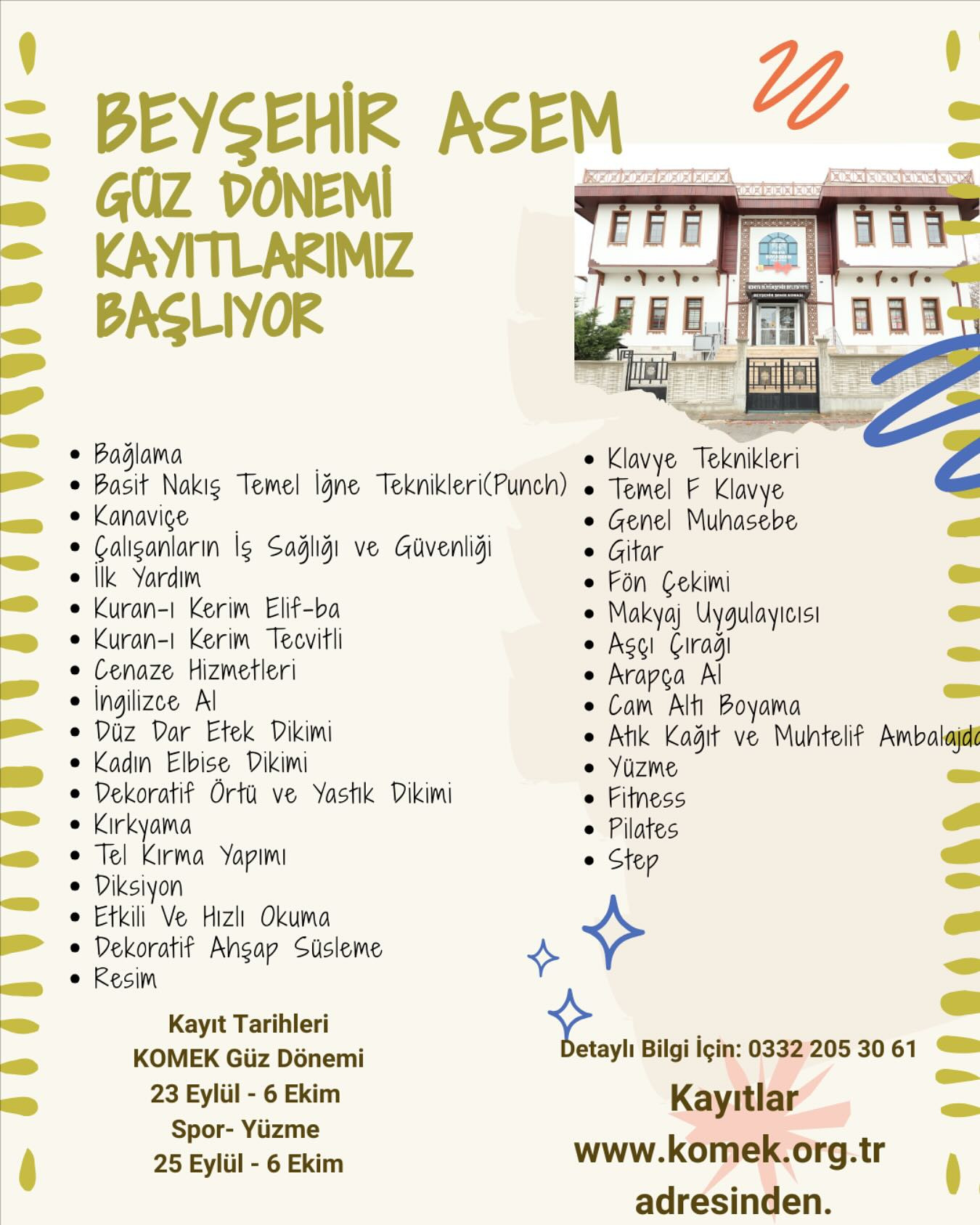 Beyşehir ASEM’den yapılan açıklamada, güz dönemi açılması planlanan kurs branşları da belli oldu.