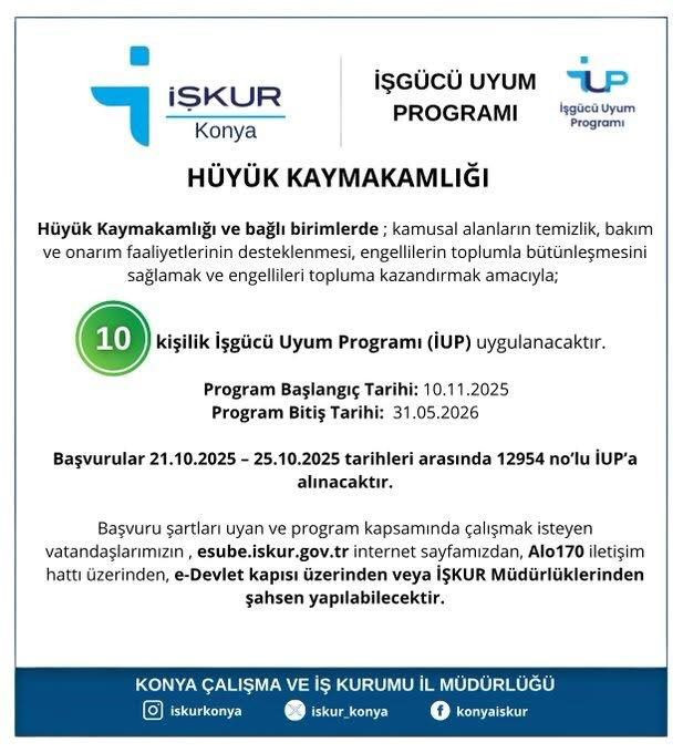 Öte yandan, Hüyük İlçe Kaymakamlığı ve bağlı birimlerde engellilerin toplumla bütünleşmesini sağlamak ve topluma kazandırmak amacıyla, temizlik, bakım, onarım vb.çalıştırılmak üzere 10 personel alımı yapılacağı duyuruldu.