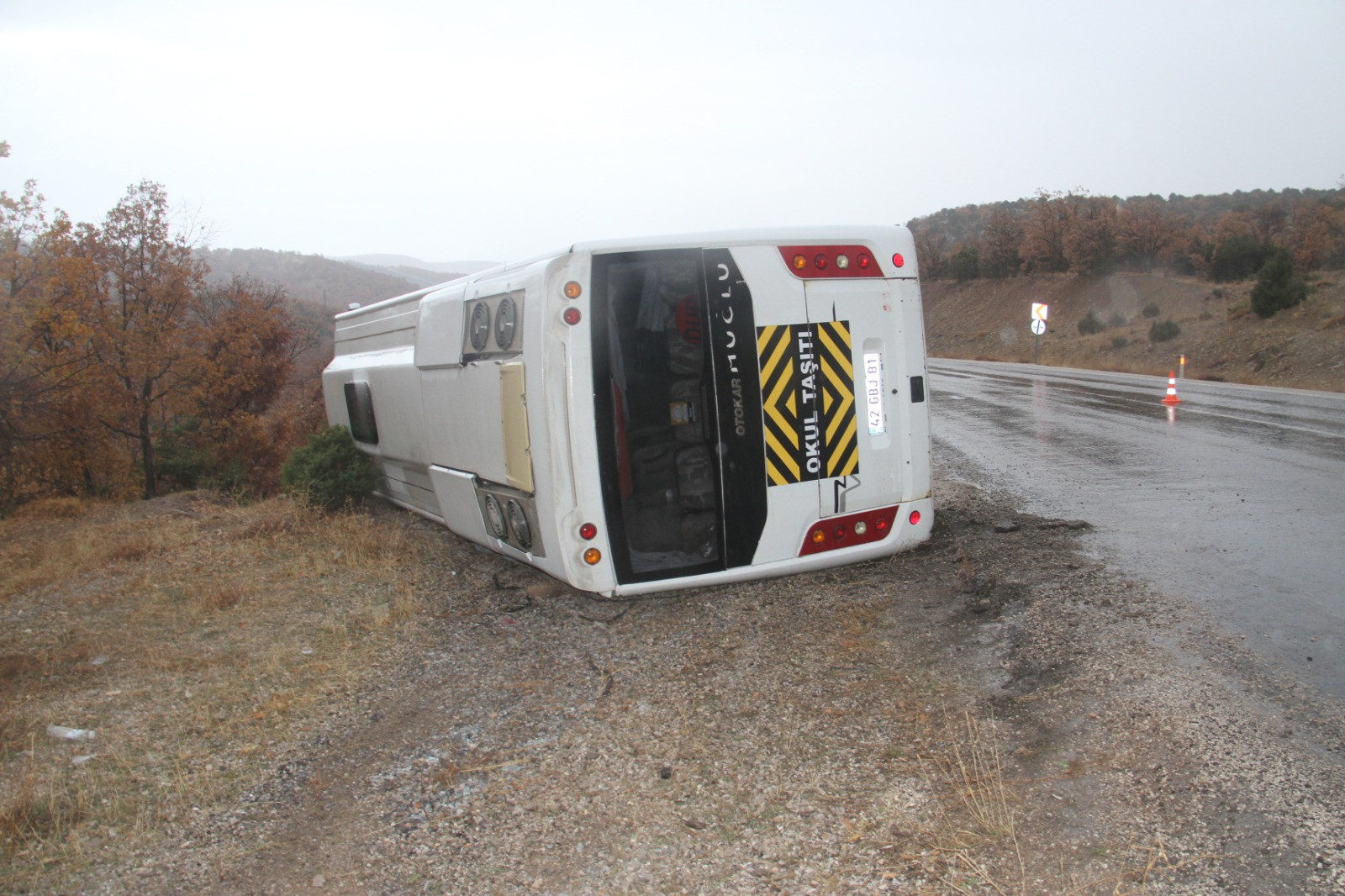 Beyşehir ilçe merkezinde öğrenim gören Huğlu Mahallesinde ikamet eden öğrencileri taşıyan D.K. (38) idaresindeki 42 GBJ 81 plakalı öğrenci servisi, Beyşehir yönüne seyir halinde iken Kayabaşı Mahallesi yakınlarında yağışlı hava nedeniyle sürücüsünün direksiyon hakimiyetini yitirmesi sonucu yoldan çıkarak şarampole devrildi.