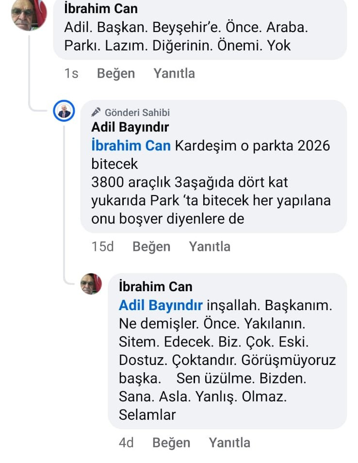 Duyurunun ardından bir takipçisinden gelen; “Adil Başkanım, Beyşehir’e önce araba parkı lazım. Diğerinin önemi yok” yorumuna cevap veren Bayındır, “Kardeşim o parkta 2026’da bitecek. 3800 araçlık 3 aşağıda dört kat yukarıda park da bitecek.”ifadelerini kullandı.