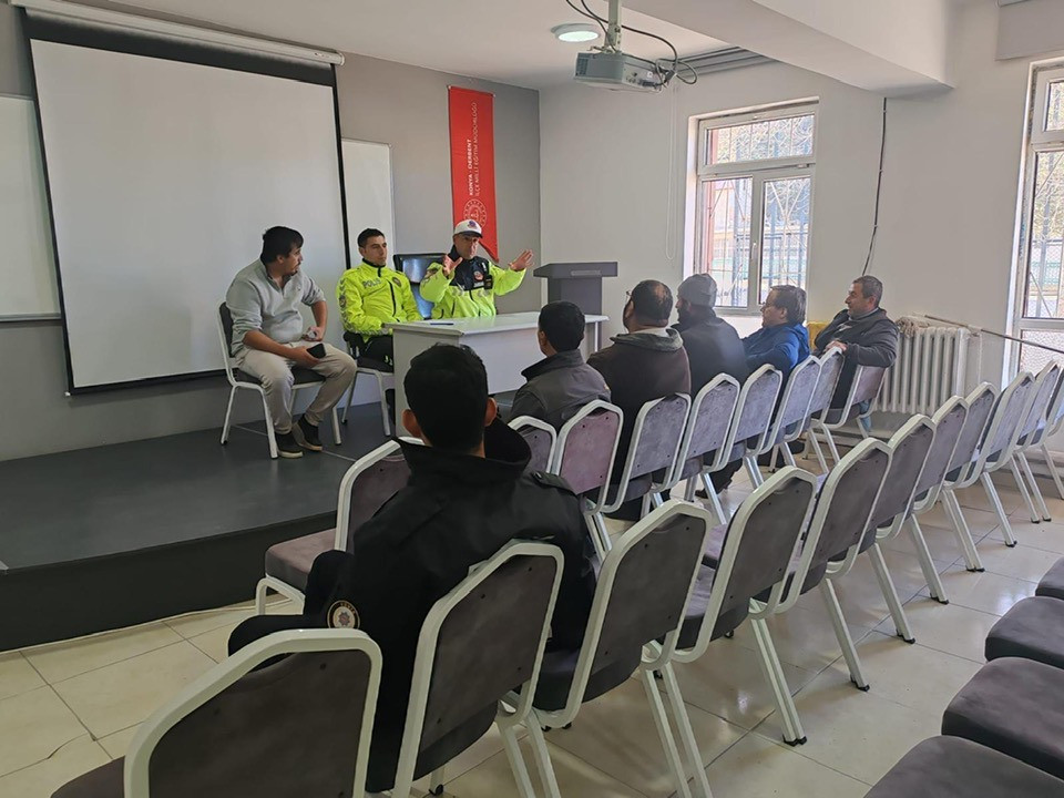 Beyşehir Jandarma Trafik ekipleri ile Derbent İlçe Emniyet Müdürlüğü görevlileri tarafından verilen eğitimde, şoförlere olumsuz hava şartlarına karşı alınması gereken güvenlik önlemleri aktarıldı.