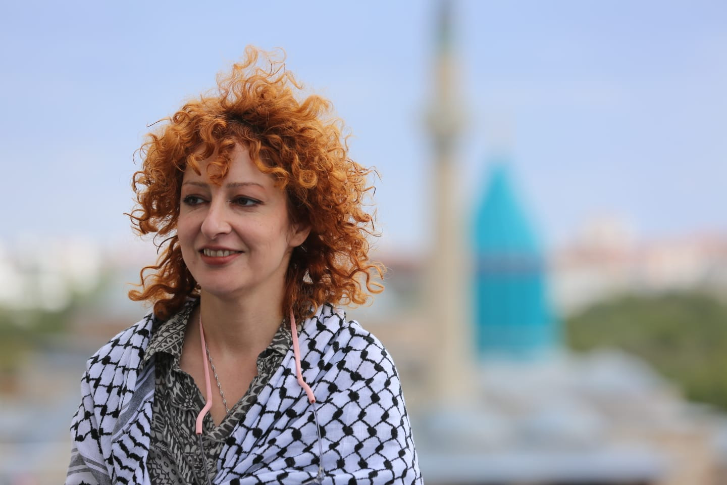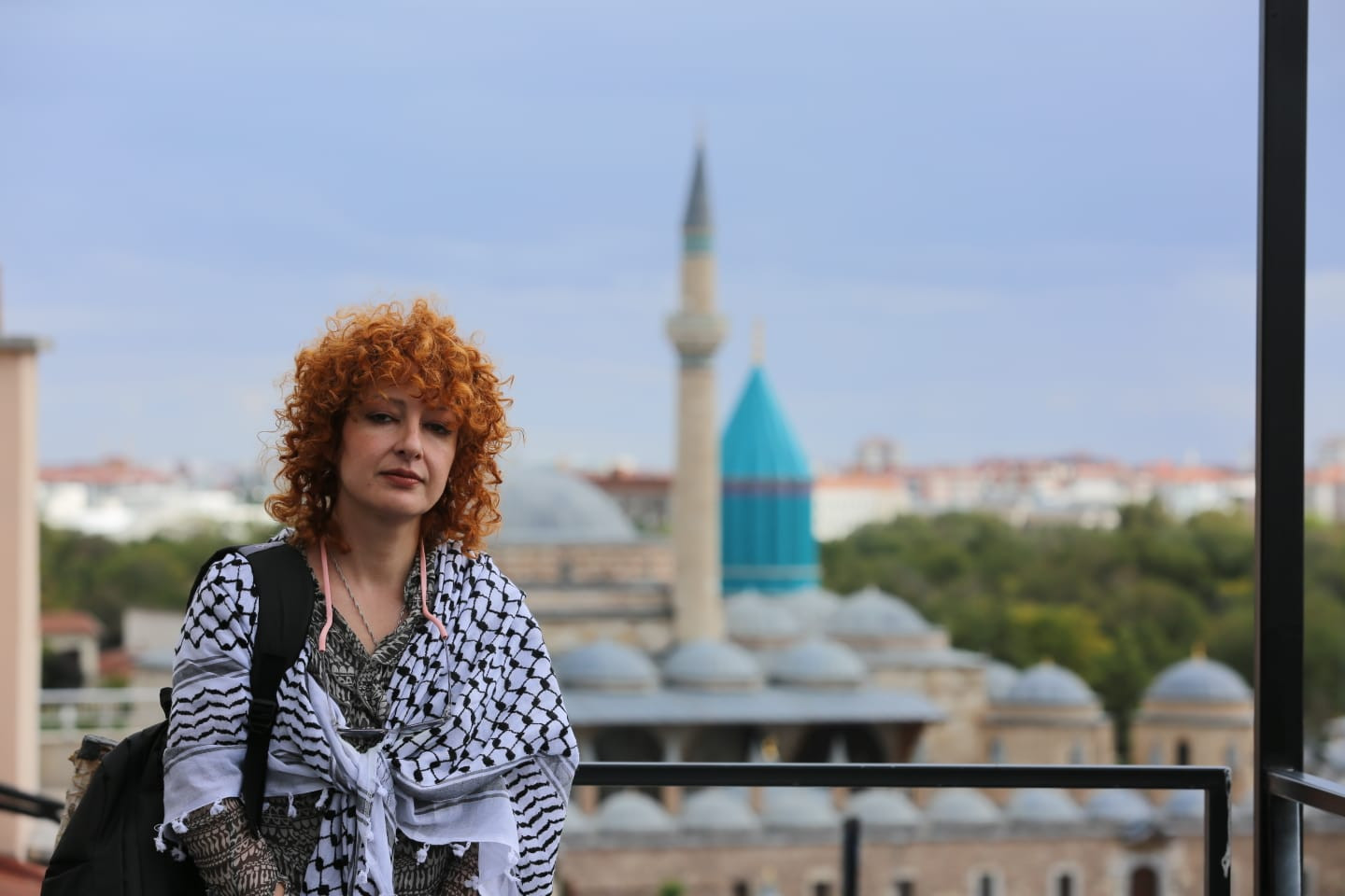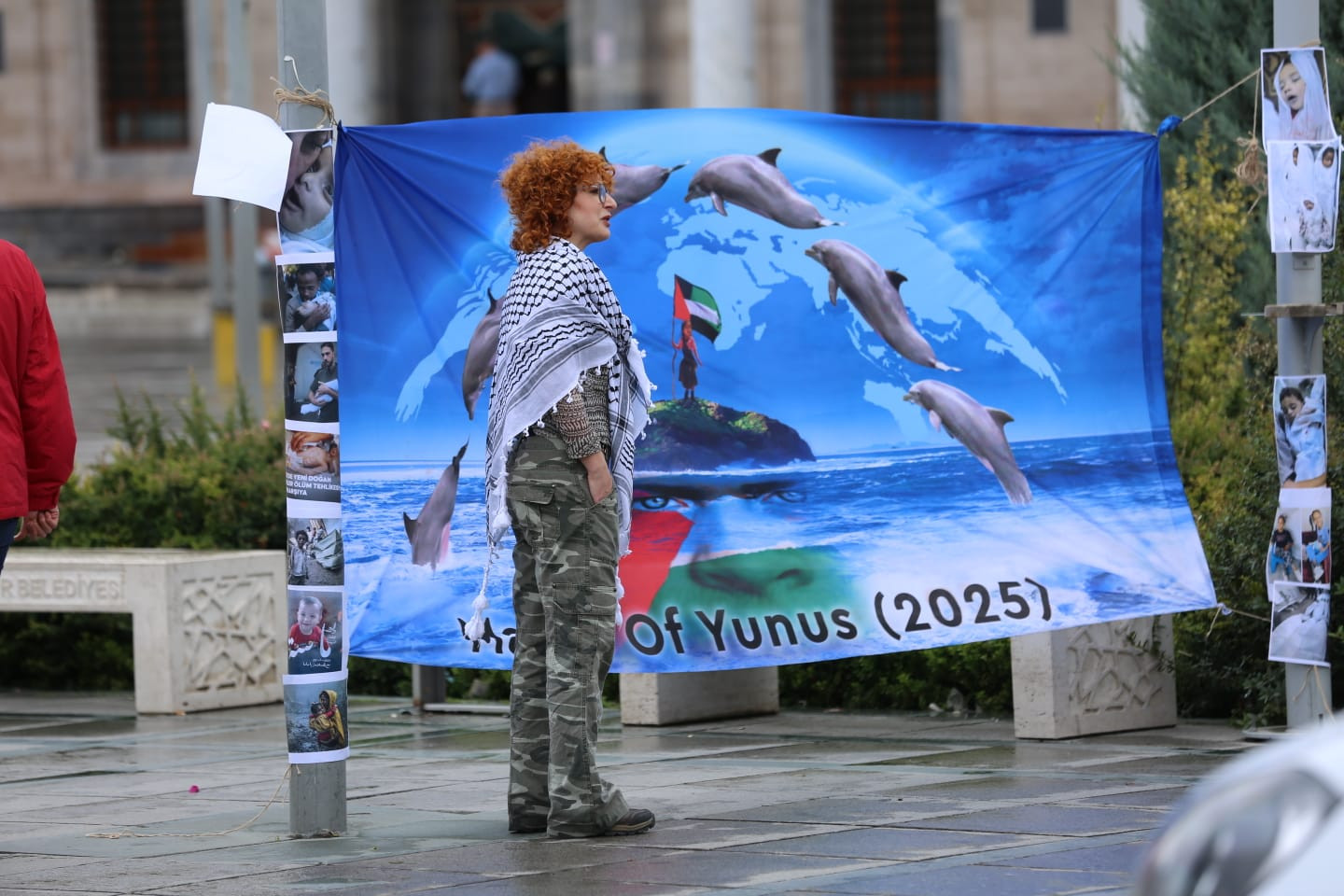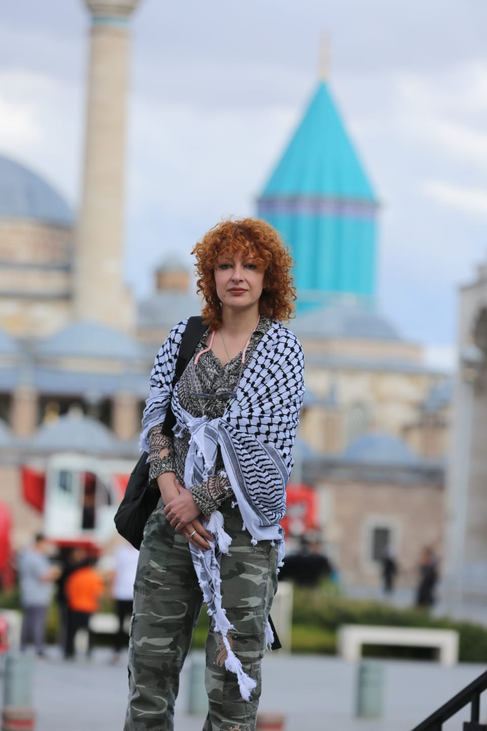Gazze'de çocukların acı veren bir durumda olduğu için yürüyüşe başlayan ve kendisini Nazenin olarak adlandıran Somayeh Moghadam, Mevlana Müzesi önünde pankart açarak açıklama yaptı.