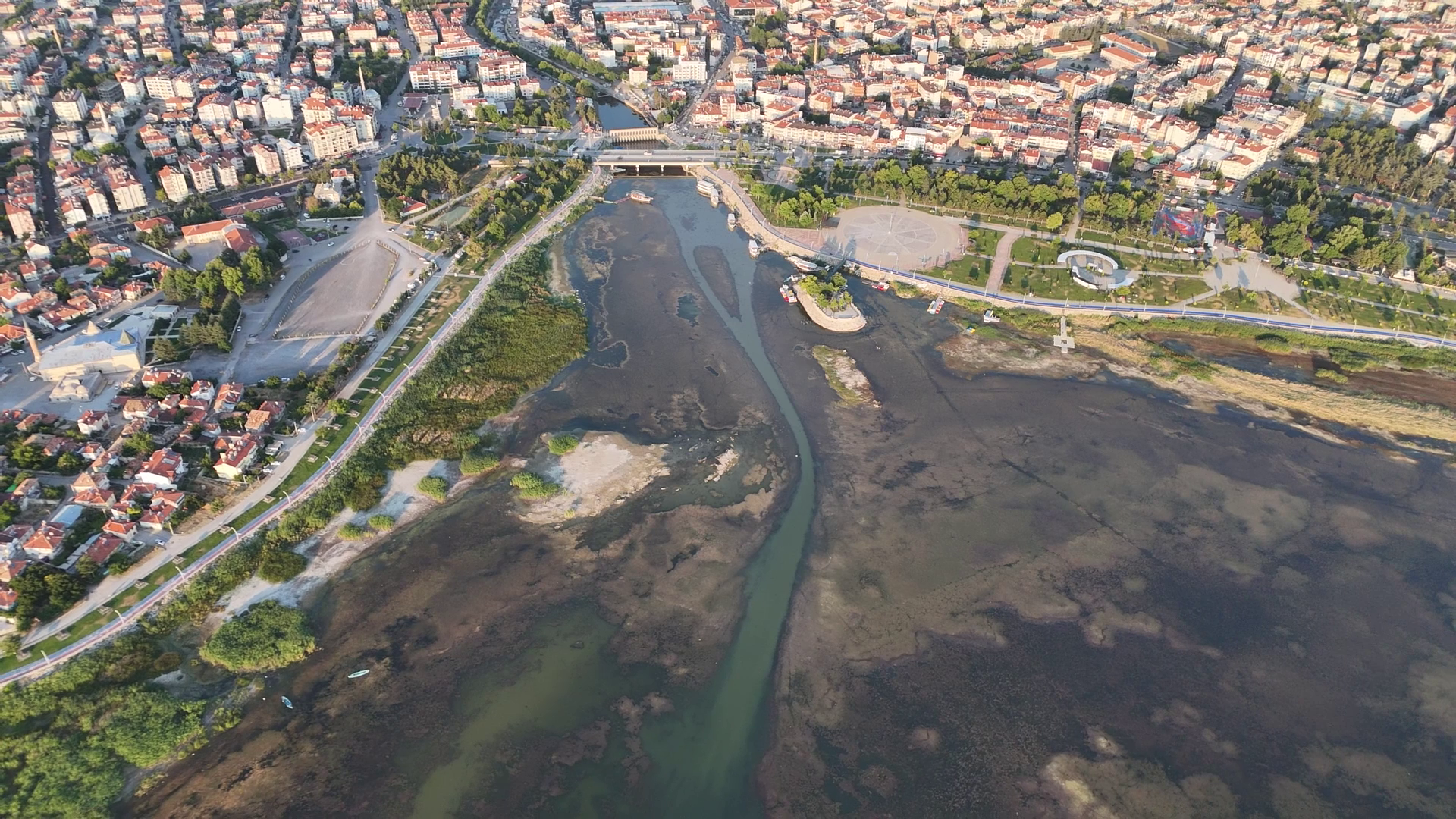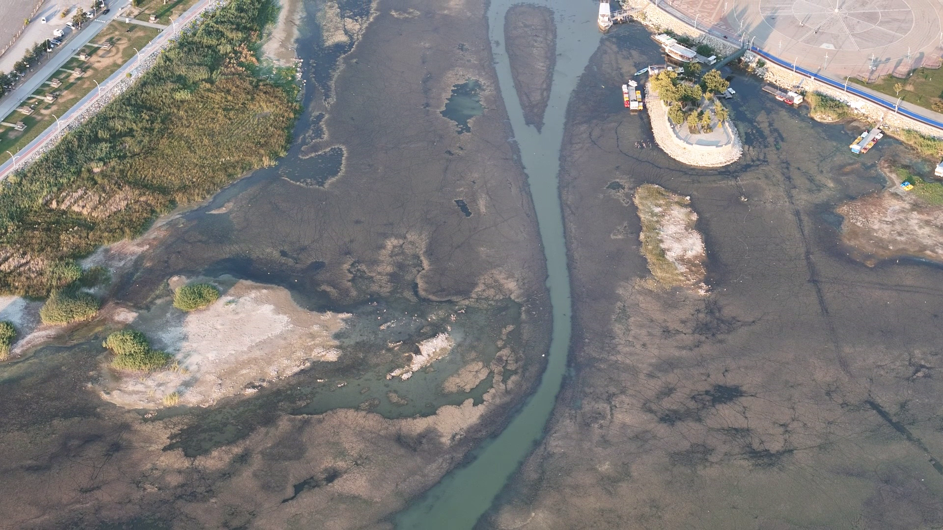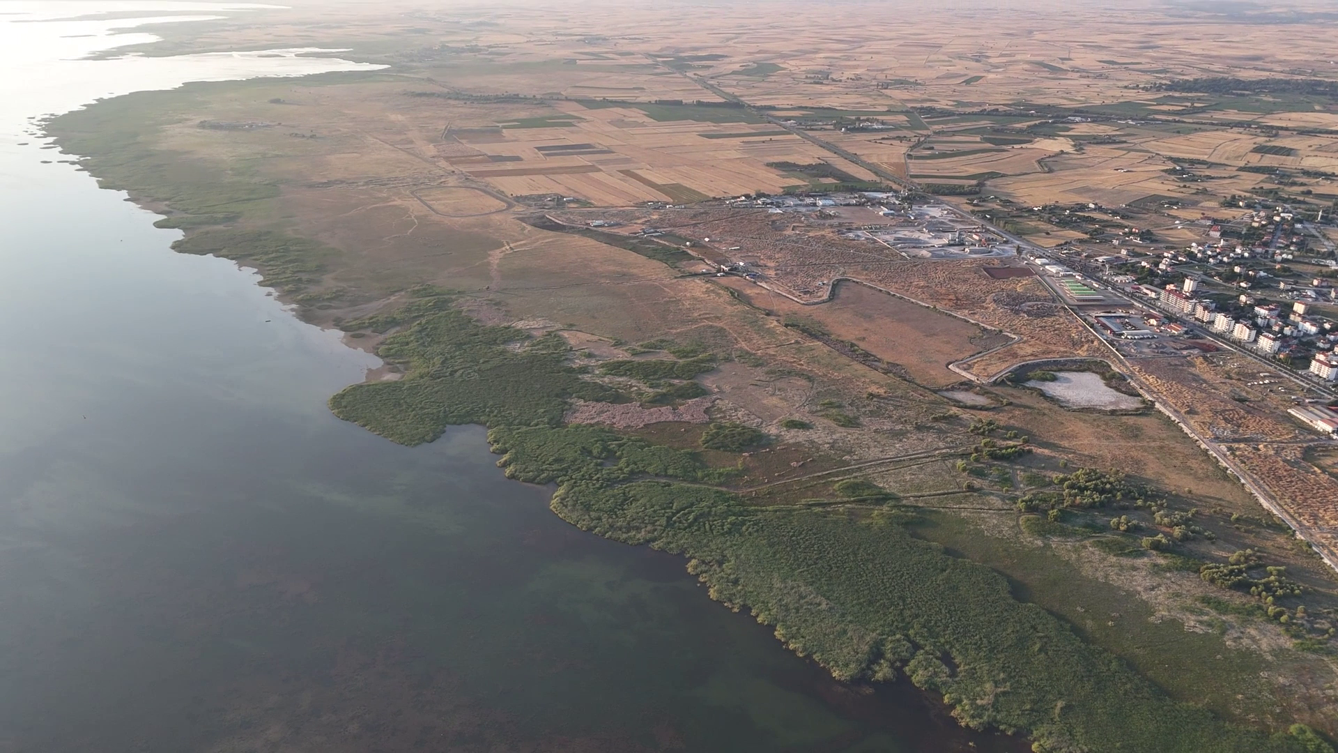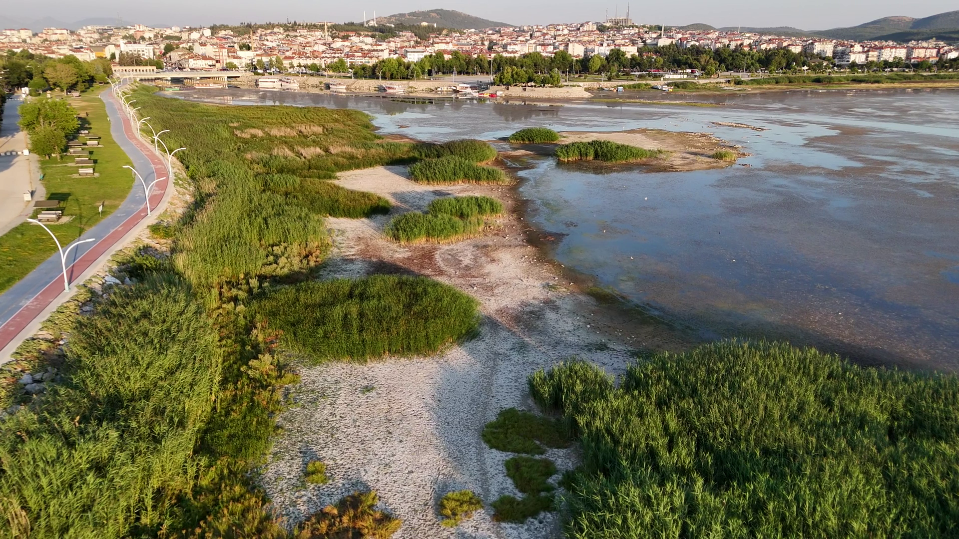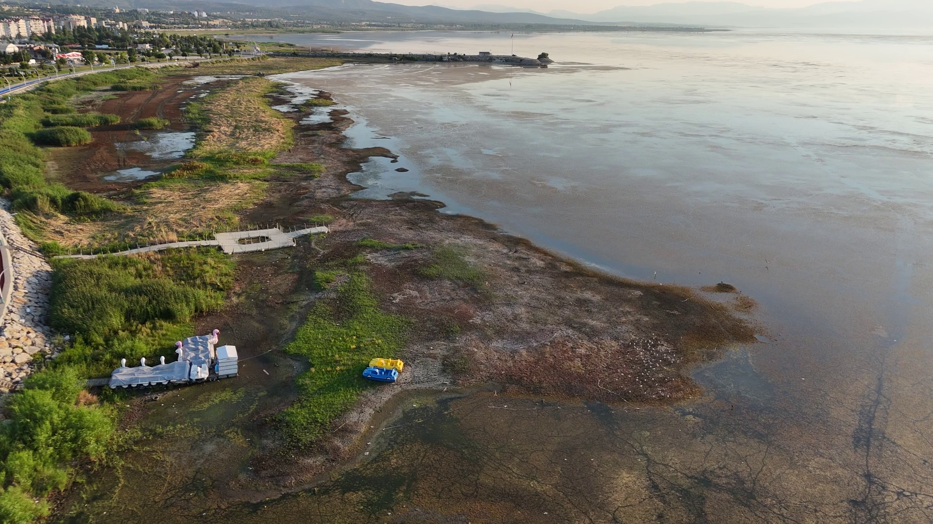 Göl sularının sığlaşması nedeniyle sığ sularda beslenen su kuşlarının ve balıkçılların da akın ettiği gölde yaşanan son tablo görenleri hüzünlendirirken, yaşanan durum dronla havadan da görüntülendi.