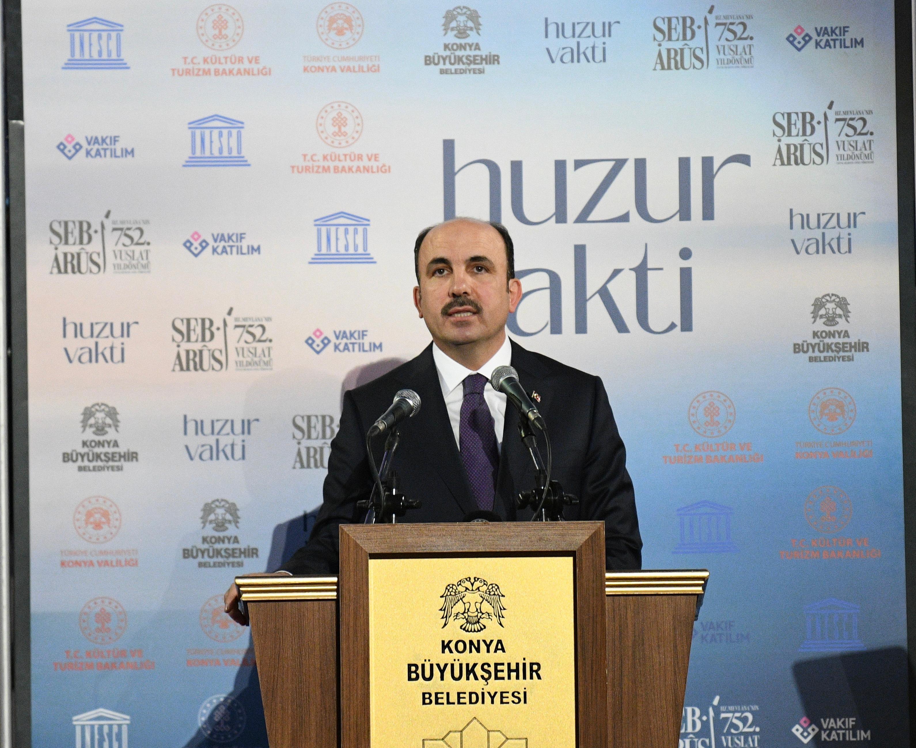 Kültür ve Turizm Bakan Mehmet Nuri Ersoy da, Hazreti Mevlana'nın "Aşk nedir?" Sorusuna "Ben ol da bil." şeklinde cevap verdiğini hatırlatarak, insanların Mevlana’nın eserlerinden alacağı lezzet ve ibretin de farklı olacağını söylemenin yanlış olmayacağını belirtti.