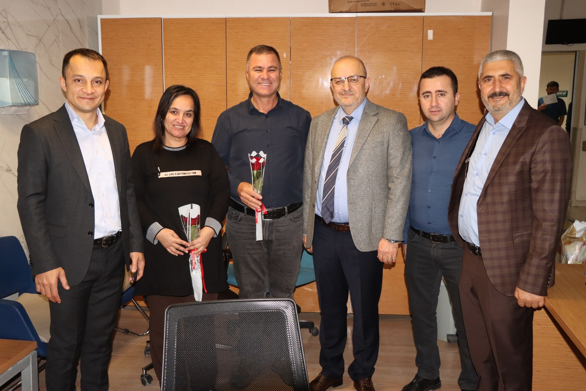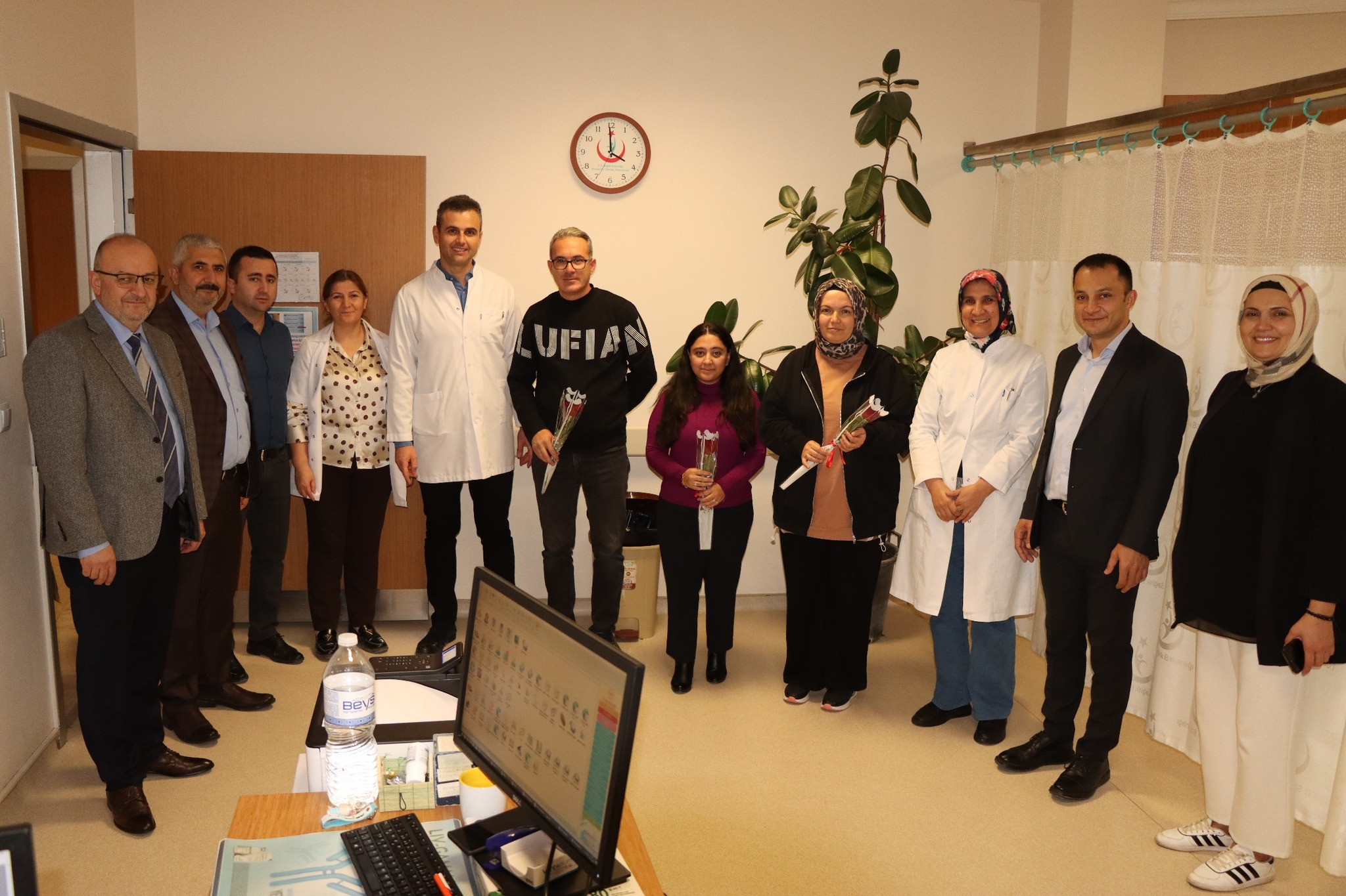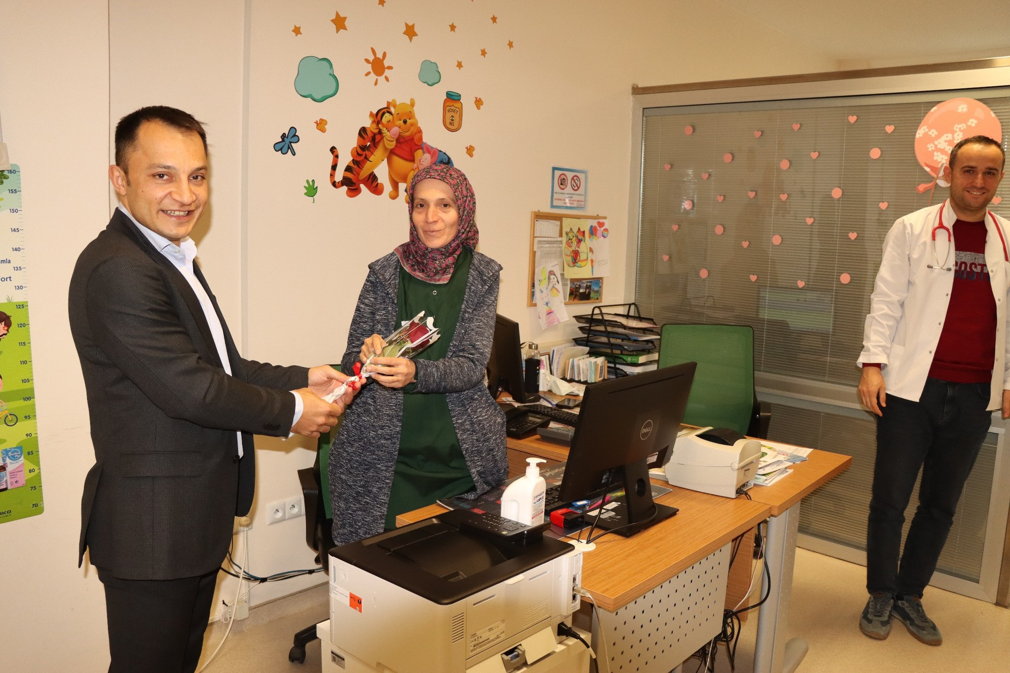 Başhekim Uzm. Dr. Sıtkı Küçükbuzcu, Başhekim Yardımcısı Dr. Kutay Güven, İdari ve Mali Hizmetler Müdürü Mesut Sodan, Sağlık Bakım Hizmetleri Müdürü Gülşen Parlakkaya, İdari ve Mali Hizmetler Müdür Yardımcısı Mustafa Akın ve Sağlık Bakım Hizmetleri Müdür Yardımcısı İlknur Gülol, hastanede görev yapan tıbbi sekreterleri tek tek ziyaret ederek çiçek takdim etti.