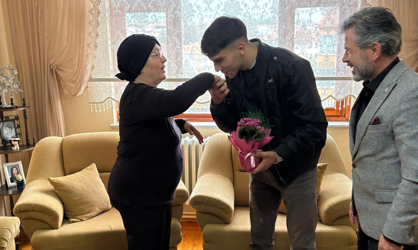 Kazan, ilkokul öğretmeni Hasan Hüseyin Sodan ile oğlunun hayatına dokunan emekli öğretmenlerden Şerife Saldır’ı ikamet ettiği evinde ziyaret etti.