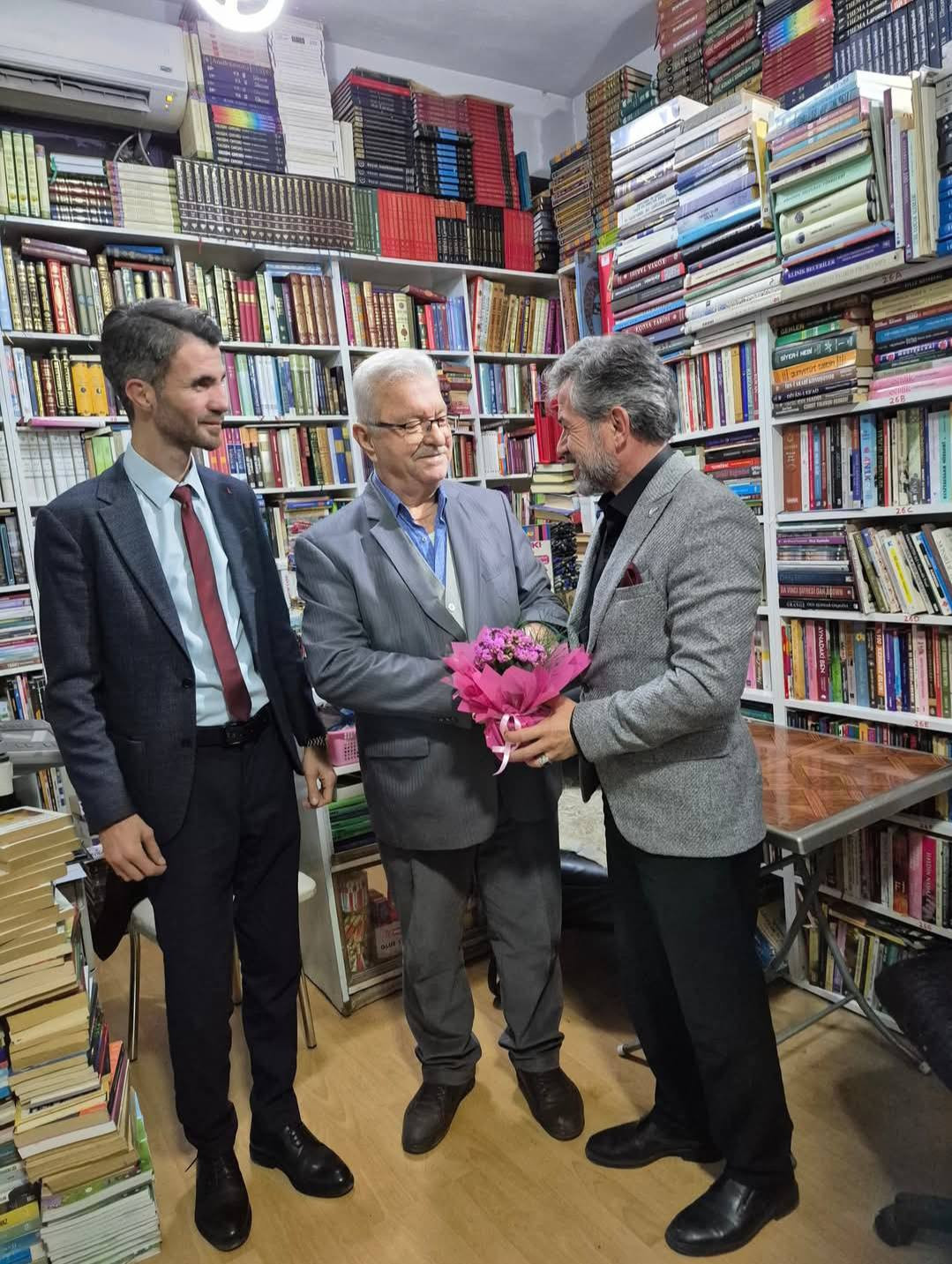 Oğlunun çiçek takdiminde bulunup öğretmeninin elini öptüğü ziyarette Kazan, emekli öğretmen Saldır ve tüm öğretmenlerin gününü tebrik etti.