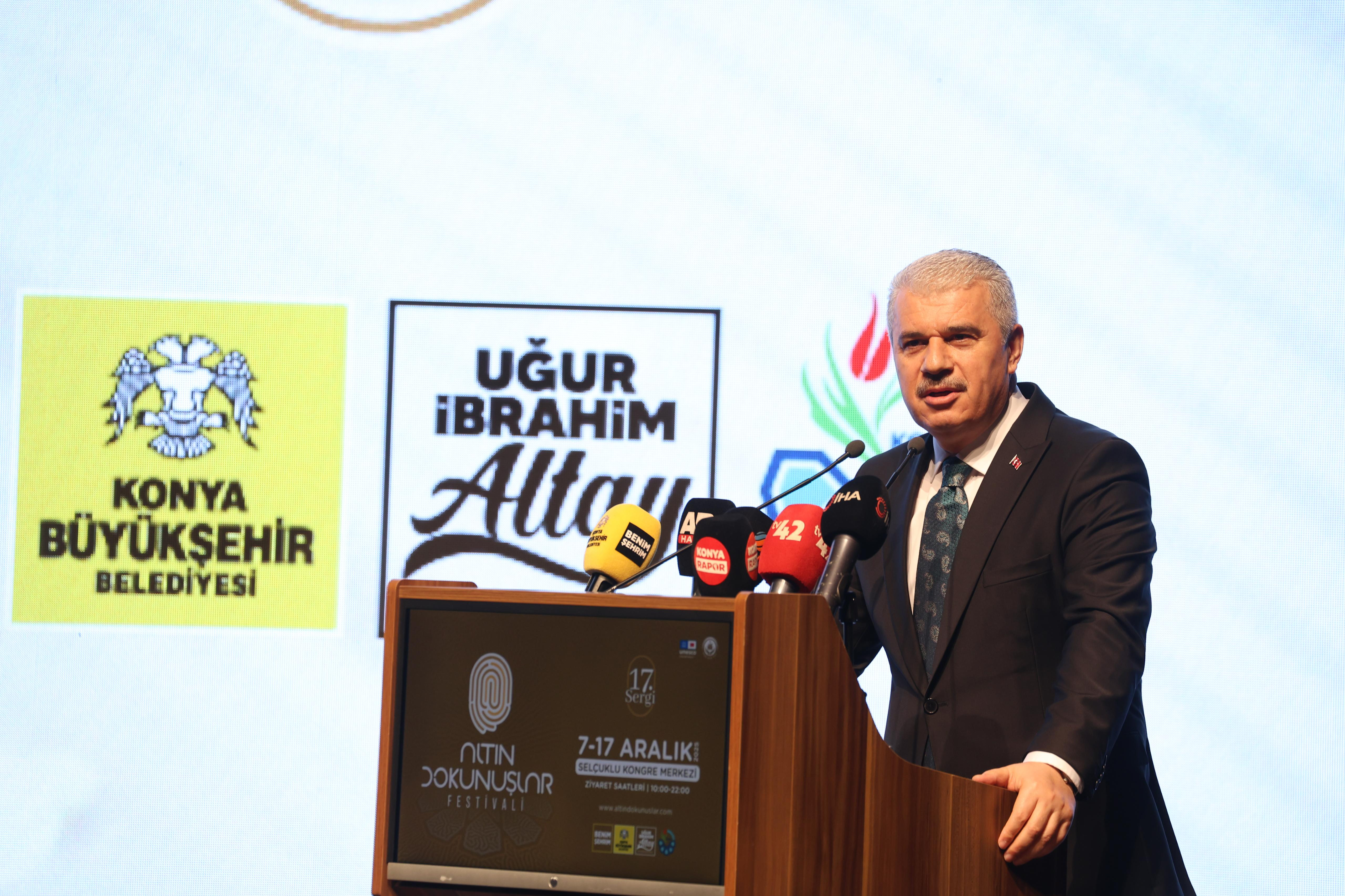 Selçuklu Kongre Merkezi’nde düzenlenen programda konuşan Konya Büyükşehir Belediye Başkanı Uğur İbrahim Altay, “Altın Dokunuşlar Festivali’nin el emeğini estetikle buluşturan; sabırla ve zarafetle yoğrulmuş eserleri bir araya getiren bir sergi olduğunu söyledi.