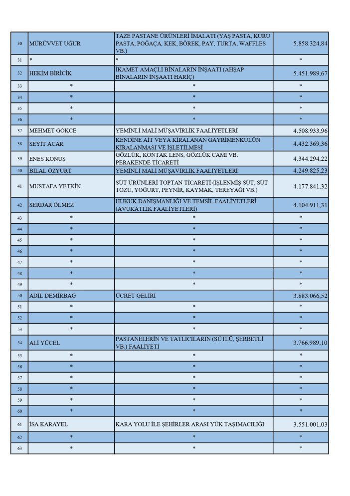 Rekortmenler listesinde ayrıca noterler, mali müşavirler, gıda, gayrimenkul ve inşaat alanlarında faaliyet gösteren çok sayıda isim yer aldı.