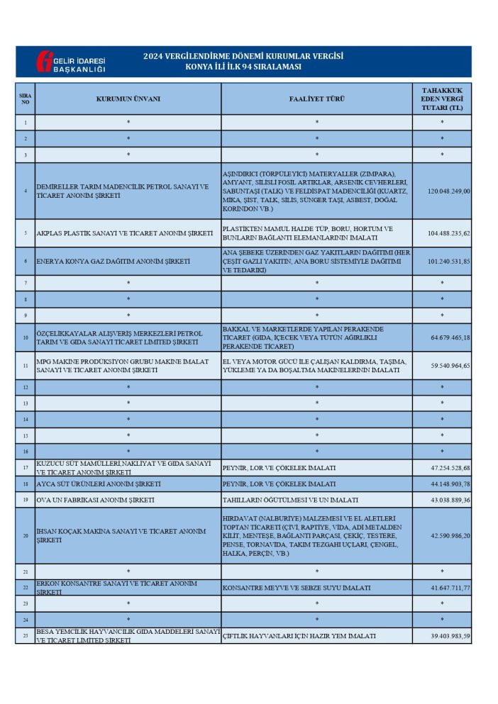 Konya Vergi Dairesi Başkanlığı, 2024 yılı vergilendirme dönemine ait gelir ve kurumlar vergisi rekortmenleri listesini kamuoyuyla paylaştı.