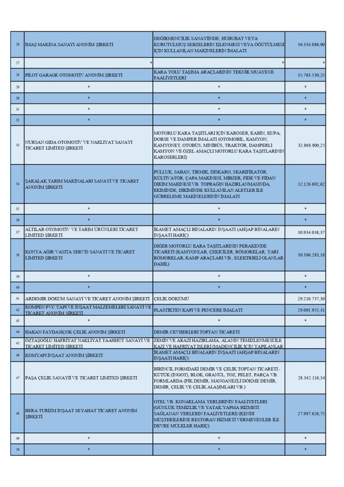 Kurumlar vergisi rekortmenleri listesinde ise Konya ekonomisinin lokomotif sektörleri olan gıda, makine ve sanayi kuruluşları ön plana çıktı.