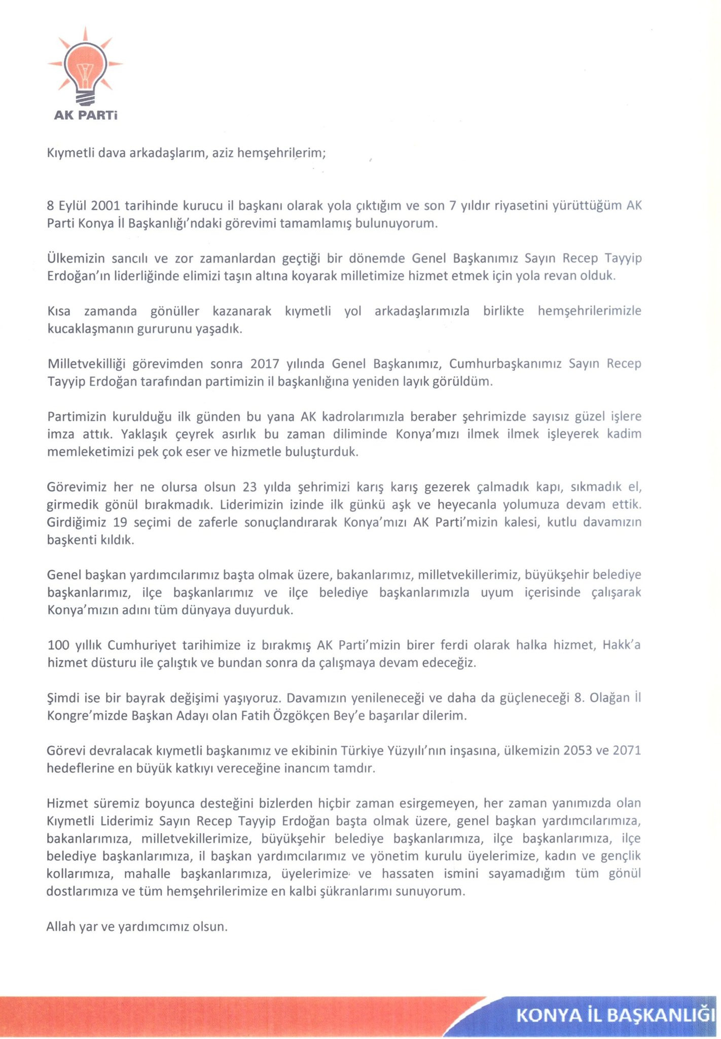 "Kıymetli dava arkadaşlarım, aziz hemşehrilerim; AK Parti Konya İl Başkanlığı görevimi tamamlamış bulunuyorum. 8. Olağan İl Kongre'mizde Başkan Adayı olan Fatih Özgökçen Bey'e başarılar dilerim.