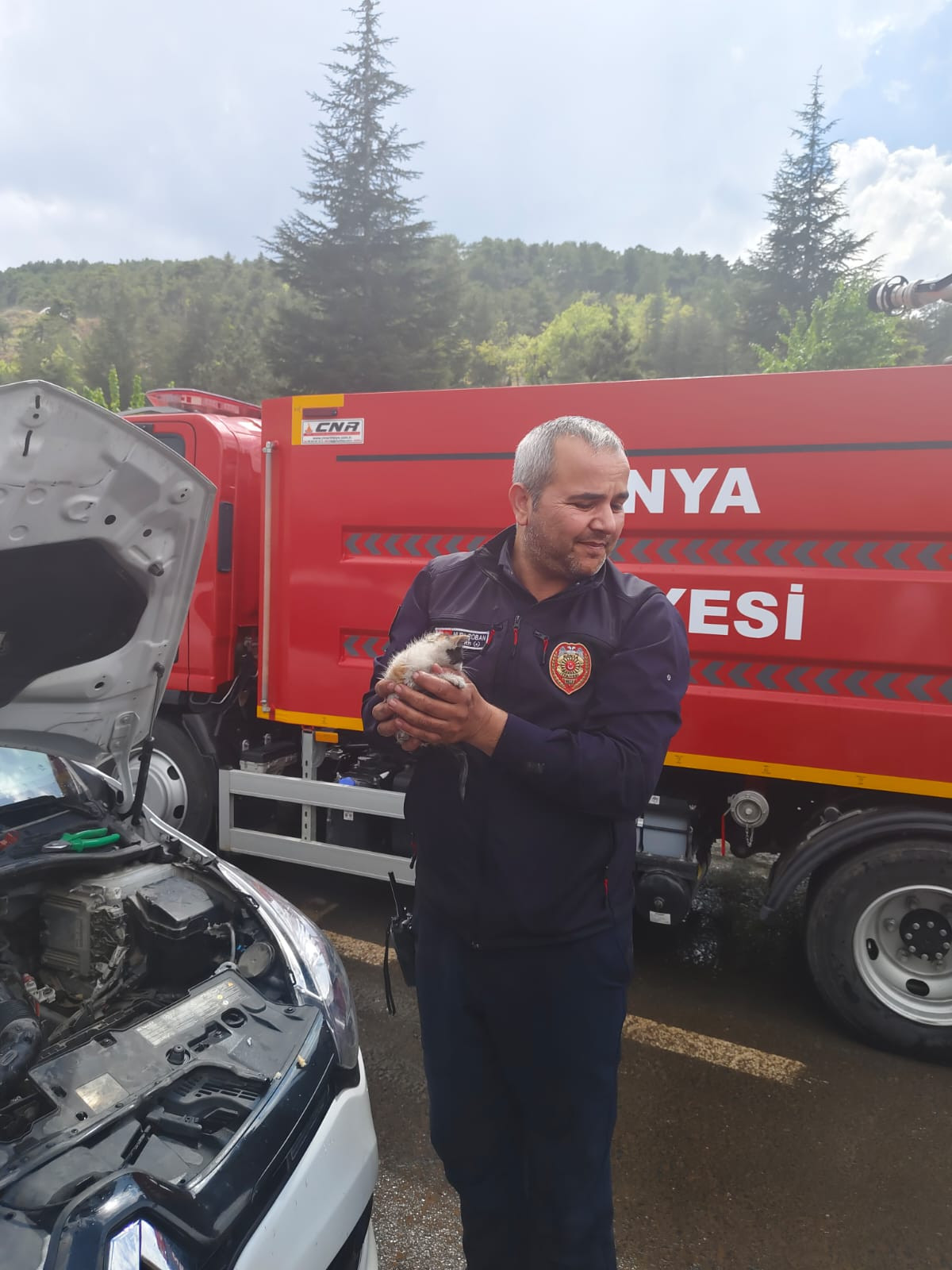 İhbar üzerine adrese itfaiye ekipleri yönlendirildi. Otomobilin motor kısmında sıkıştığı belirlenen kediyi bulunduğu yerden çıkarabilmek için uzun süre uğraş veren itfaiye görevlisi Nuri Çoban, akü ve hava filtresini söktükten sonra yavru kediye ulaşabildi.