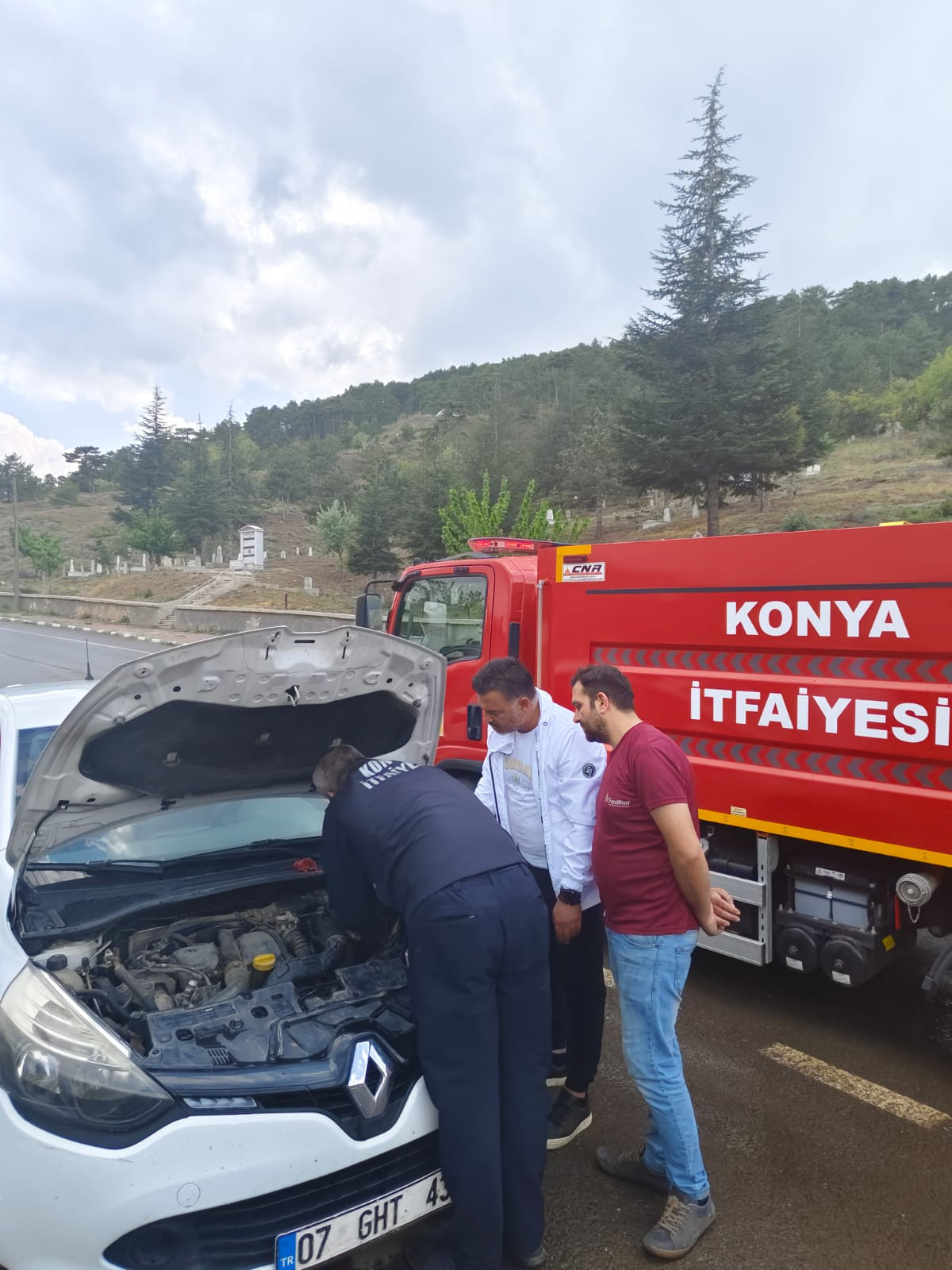 Seydişehir ilçesinden Üzümlü Mahallesi’ne 07 GHT 43 plakalı aracıyla gelen sürücü, mezarlık karşısındaki yolda otomobilinin yanına geldiğinde motor bölümünden bir kedi sesi geldiğini fark etti.