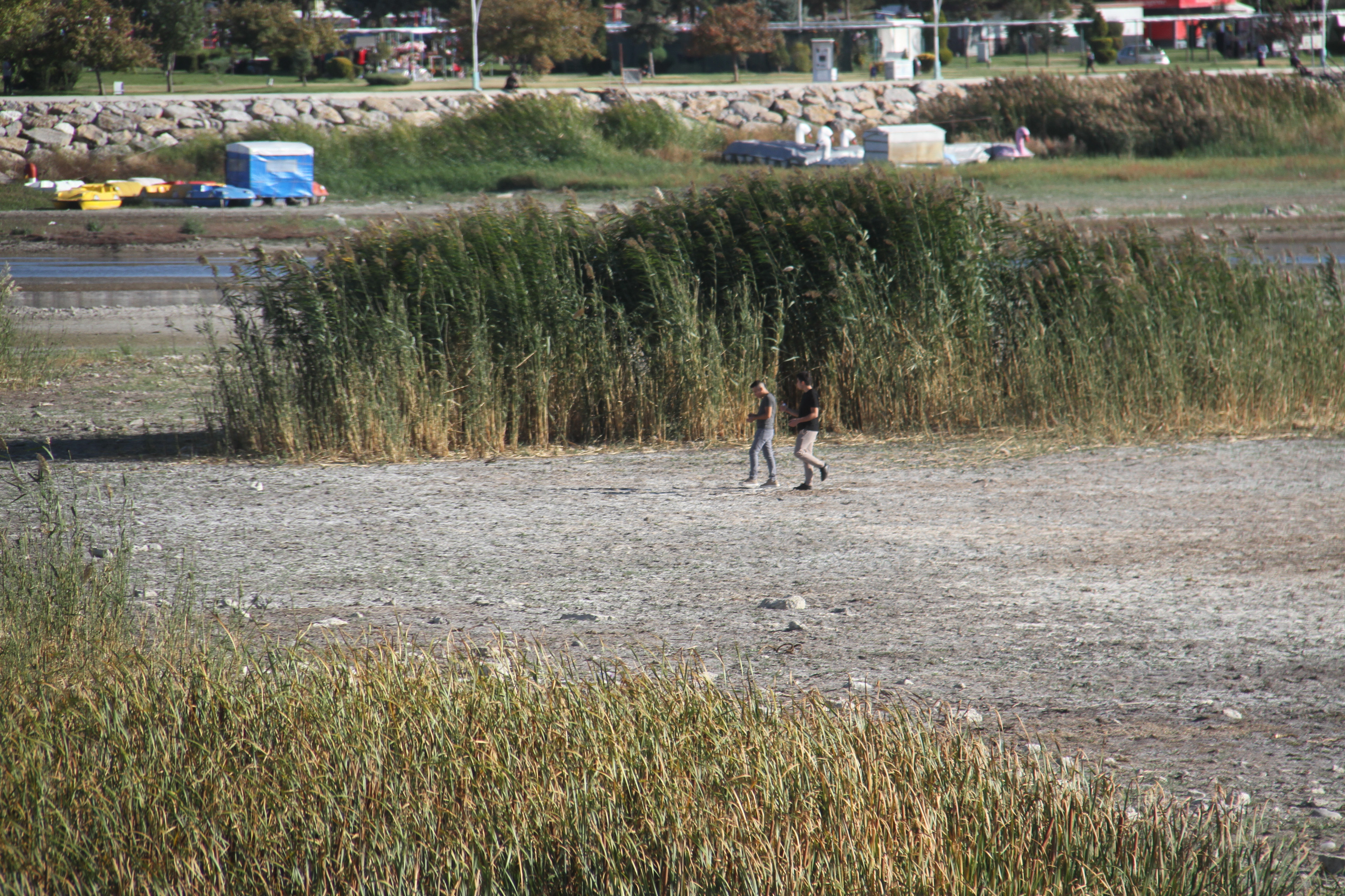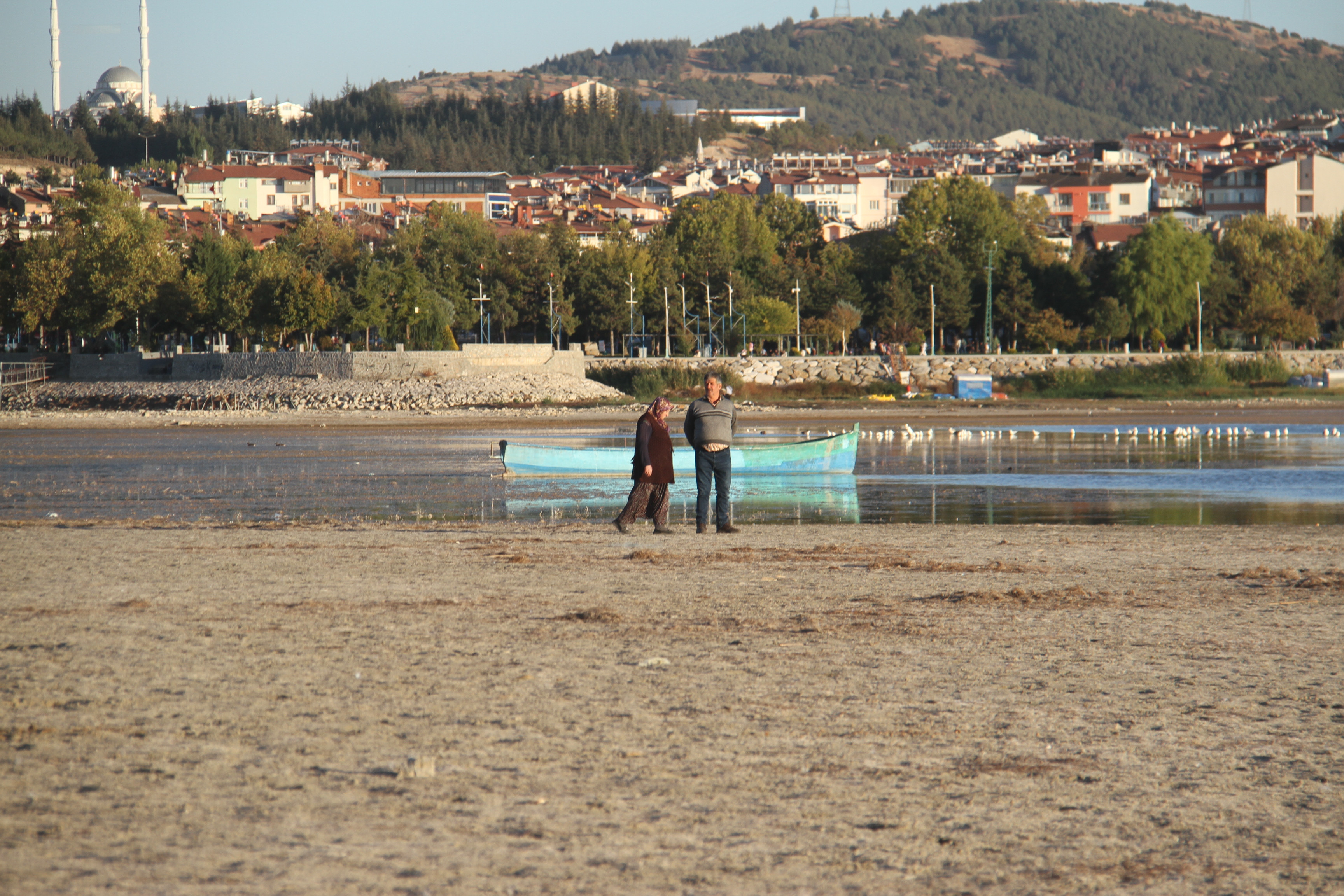 Türkiye’nin önemli tatlı su balığı üretim merkezlerinden Beyşehir Gölünde balıkçıların ağlarını serdiği, avlandığı gölün kuruyan kesimlerinin kara parçasına dönüştüğü yerlerde insanlar gezinti yapıyor, yürüyüş gerçekleştiriyor.