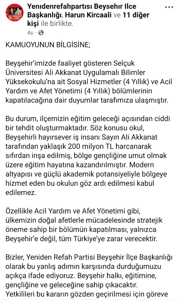 Bizler, Yeniden Refah Partisi Beyşehir İlçe Başkanlığı olarak bu yanlış adımın karşısında durduğumuzu açıkça ifade ediyoruz. Beyşehir halkı, eğitimine, gençliğine ve geleceğine sahip çıkacaktır.