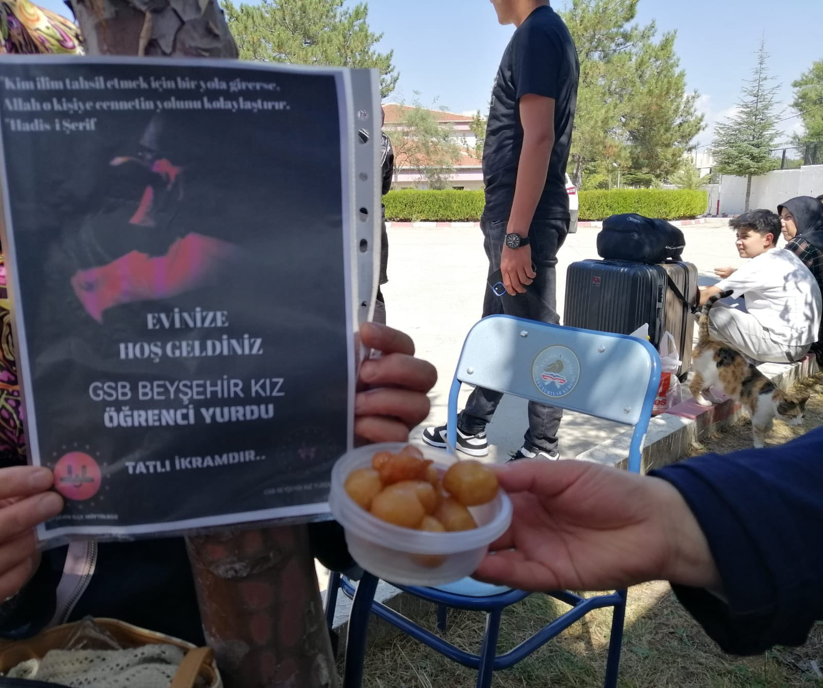 Ömer Akkanat Yurt Müdürlüğü yurda yeni kayıt yaptıran öğrenciler ile ailelerini Beyşehir Müftülüğü işbirliği ile düzenlenen programda lokma tatlısı ikramlarıyla dualarla karşıladı.