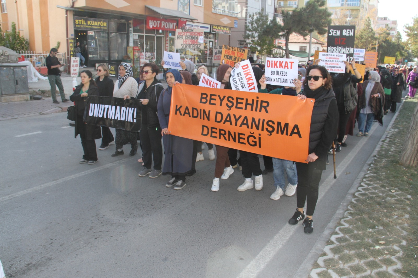 Beyşehir Kadın Dayanışma Derneği tarafından düzenlenen kadın ve çocuk cinayetlerine ve kadına şiddete son verilmesine yönelik, ’kadınların sessiz çığlığı’ temalı tepki yürüyüşü, orman kavşağında başladı, Antalya Caddesinde devam ederek anıt alanında son buldu.