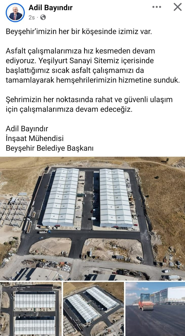Başkan Bayındır, kişisel sosyal medya hesabından yaptığı paylaşımda Yeşilyurt sanayi sitesi içerisinde başlatılan sıcak asfalt çalışmalarına yönelik belediyenin çalışmalarını duyurdu, vatandaşları bilgilendirdi.
