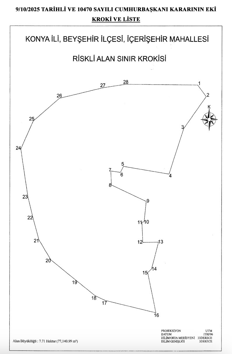 Beyşehir ilçesine bağlı İçerişehir Mahallesi, Cumhurbaşkanı kararıyla “riskli alan” ilan edildi. Karar, 10 Ekim 2025 tarihli Resmî Gazete’de yayımlandı.