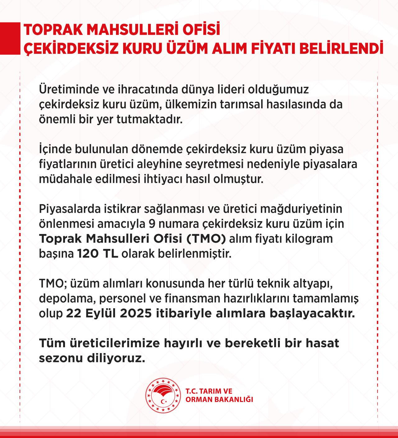 “Piyasalarda istikrar sağlanması ve üretici mağduriyetinin önlenmesi amacıyla 9 numara çekirdeksiz kuru üzüm için Toprak Mahsulleri Ofisi (TMO) alım fiyatı kilogram başına 120 TL olarak belirlenmiştir.