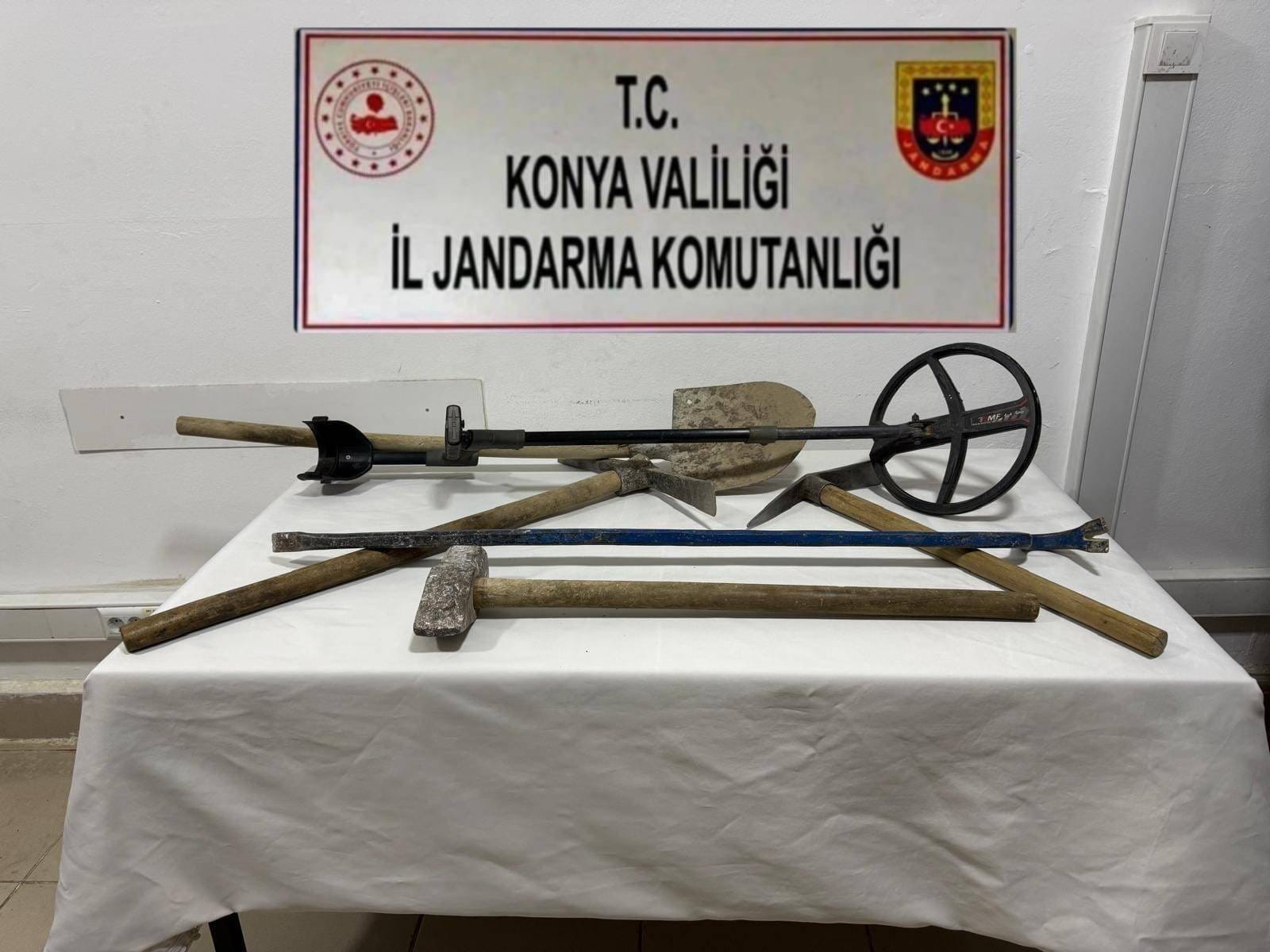 Ilgın’da yapılan çalışmalarda ise 3 kişinin izinsiz kazı yaptığı belirlendi. Olay yerinde 1 adet metal arama dedektörü, 2 kazma, 1 balyoz, 1 kürek ve 1 demir malina ele geçirildi.