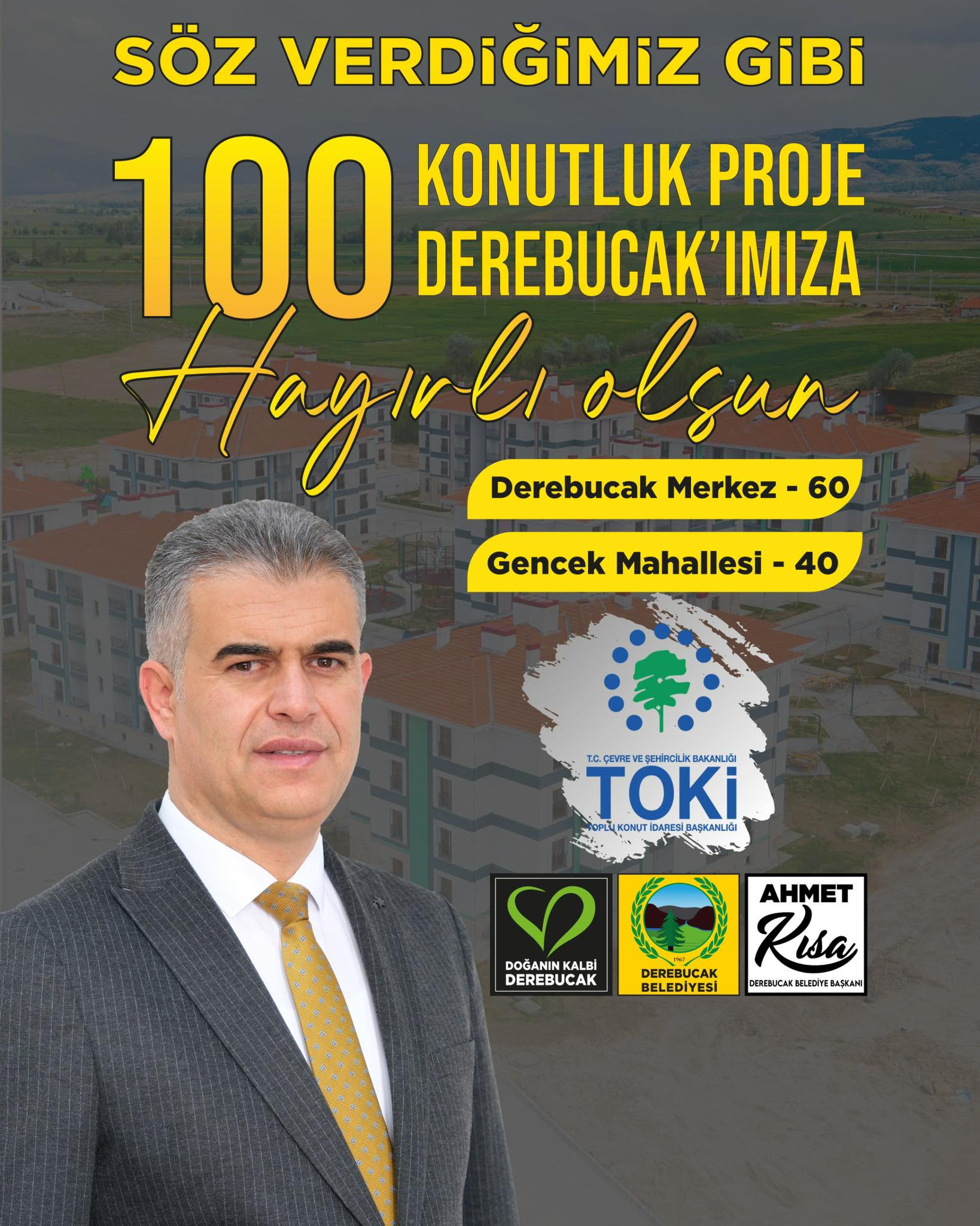 Başkan Kısa, “Derebucak’ımıza yeni TOKİ konutları müjdesi” cümleleriyle başlayan paylaşımında; projeye desten verenlere teşekkür etti. Kısa, “Cumhurbaşkanımız Sayın Recep Tayyip Erdoğan’ın öncülüğünde hayata geçirilen yüzyılın konut projesi kapsamında, Derebucak merkeze 60 daire ve Gencek mahallemize 40 daire olmak üzere 100 konutluk yeni TOKİ projesi kazandırıyoruz. İlçemizin gelişimine büyük katkı sağlayacak olan bu önemli yatırımın hayata geçmesinde desteklerini esirgemeyen; Sayın Recep Tayyip Erdoğan Bey olmak üzere, Çevre, Şehircilik ve İklim Değişikliği Bakanımız Sayın Murat Kurum Bey'e,AK Parti Konya İl Başkanımız Sayın Fatih Özgökçen Bey'e,