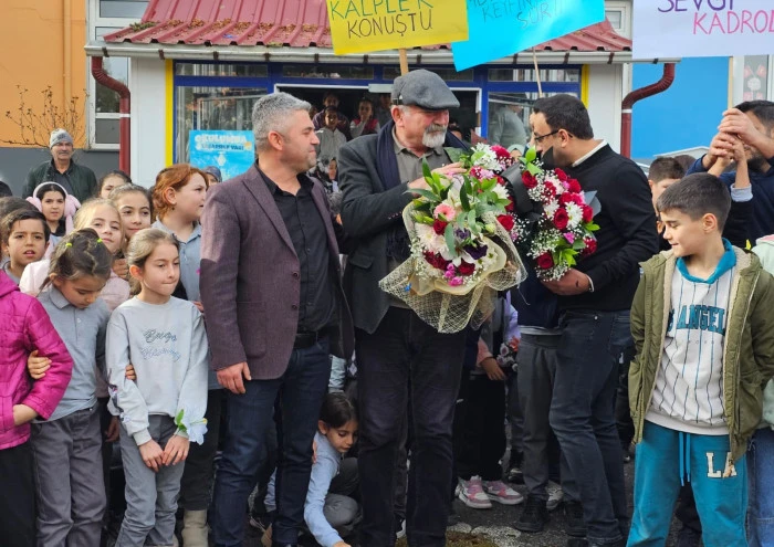 yazılı dövizler taşıyan öğrenciler, öğretmenlerine duydukları sevgi ve minneti içten ifadelerle dile getirdi.