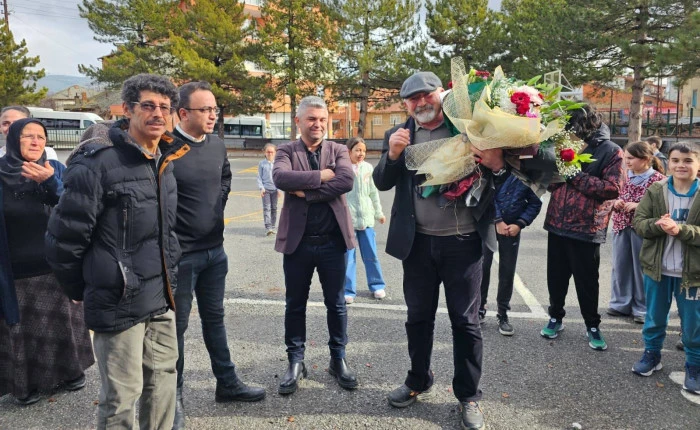 Öğrenciler, ve mesai arkadaşları tarafından çiçek buketleri takdim edilen Talat Peker, alkışlar eşliğinde okuluna veda ederken duygusal anlar yaşandı.