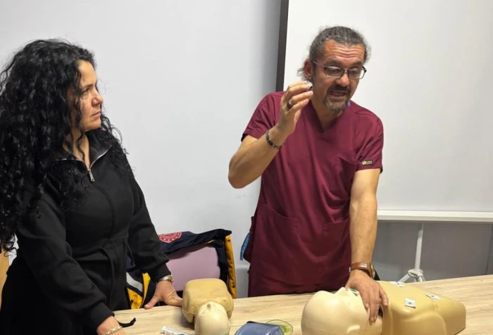 Eğitim kapsamında İlçe Sağlık Müdürlüğü Eğitim Hemşiresi Seher Ulu ve Beyşehir Devlet Hastanesi Acil Sorumlusu Hemşire Ertan Şimşek, katılımcılarla bir araya geldi.
