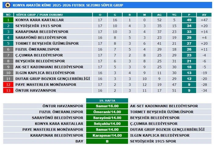 Konya Amatör Süper Grup’ta zirve ve play-off yarışı nefes kesiyor. Hem alt sıralarda hem de üst basamaklarda büyük bir çekişmenin yaşandığı ligde, birçok takım play-off bileti için kıyasıya mücadele veriyor.
