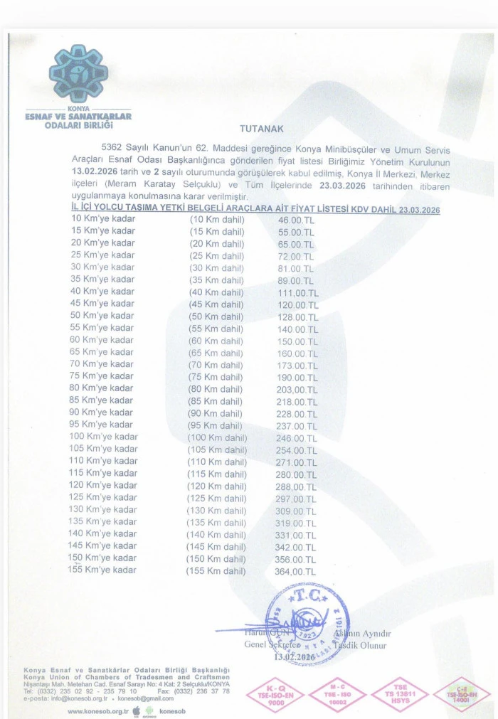 Birlik yönetim kurulunca da kabul edilen yeni tarifeye göre; Konya il merkezi ile birlikte Meram, Karatay ve Selçuklu ilçeleri dahil tüm ilçelerde il içi yolcu taşımacılığı ücretleri 23 Mart 2026 tarihinden itibaren uygulanmaya başlandı. Belirlenen ücretlerin KDV dahil olduğu bildirildi.