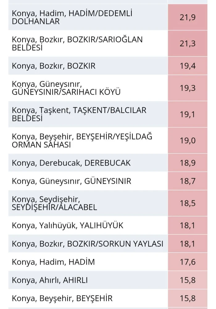 Yağışlardan en fazla pay alan diğer bölgeler arasında Bozkır, Güneysınır Sarıhacı, Taşkent Balcılar ile Beyşehir Yeşildağ Orman Sahası ve Derebucak yer aldı.