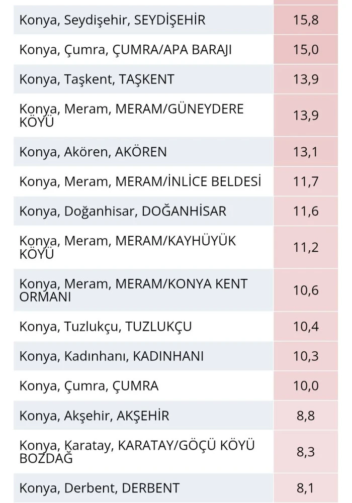 Son 24 saatlik meteorolojik verilere göre, Konya genelinde en fazla yağış Hadim Dedemli Dolhanlar bölgesine düştü.