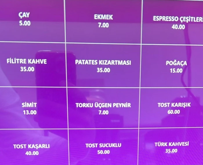 Espresso çeşitleri 40 lira, filtre kahve 35 lira, Türk kahvesi 35 lira, patates kızartması 35 lira, poğaça 15 lira, simit 13 lira, Torku üçgen peynir 7 lira, karışık tost 60 lira, kaşarlı tost 40 lira, sucuklu tost 50 lira.