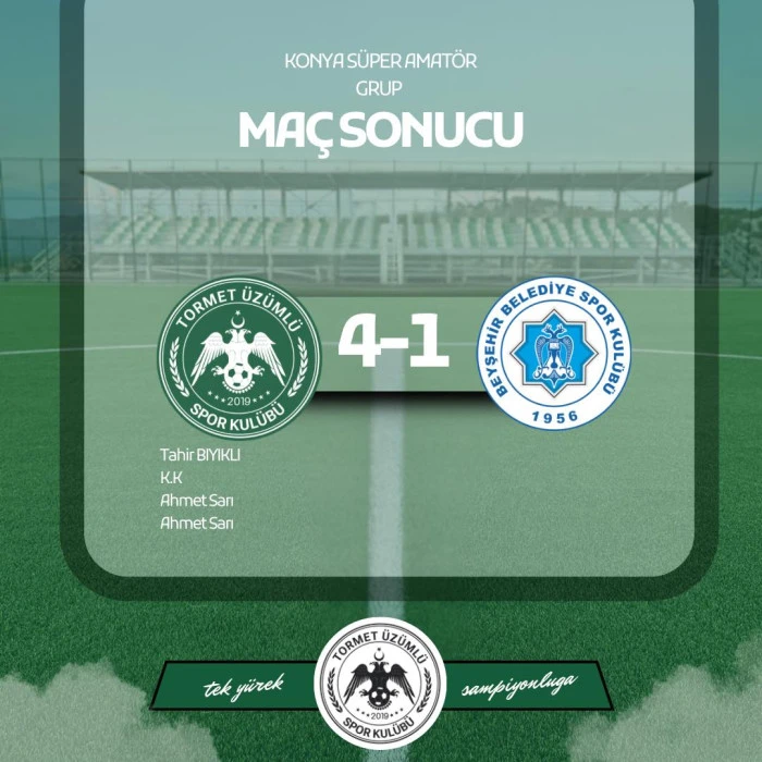Konya Amatör Küme Süper Grup’ta Beyşehir ilçesinin 2 temsilcisinin karşı karşıya geldiği derbi müsabakasında Beyşehir Belediyespor’u 4-1 mağlup eden Tormet Üzümlüspor play off iddiasını sürdürdü. Beyşehir Belediyespor ise sezonun sonuna yaklaşılırken play off yarışında çok gerilerde kaldı.