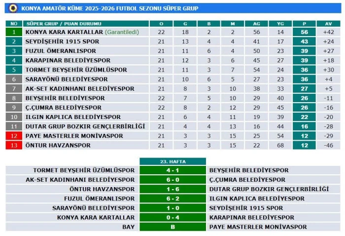 Kadınhanı Belediyespor 6-Ç.Çumra Belediyespor 0, Öntur Havzanspor 1-Bozkır G.Birliği 6, Fuzul Ömeranlıspor 6-Ilgın Kaplıca Belediye 2,Sarayönü Belediye 1-Seydişehir 1915 Spor 0, Kara Kartallarspor 0-Karapınar Belediyespor 4.
