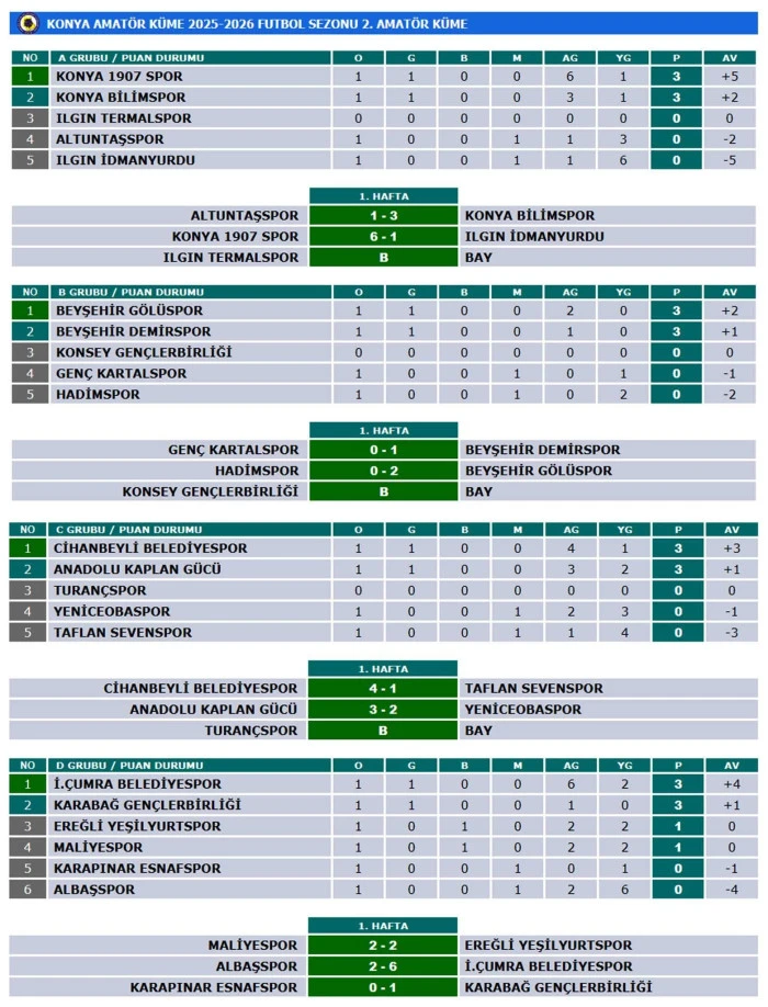 Öte yandan, grubun diğer ekiplerinden Konser Gençlerbirliği fikstür gereği ilk haftayı maç yapmadan geçti.