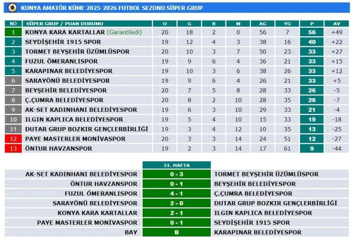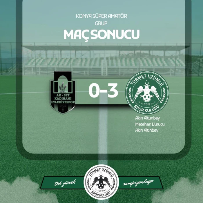 Konya Amatör Küme Süper Grup’ta play-off mücadelesi veren Tormet Beyşehir Üzümlüspor, deplasmanda karşılaştığı Kadınhanı Belediyespor’u 3-0 mağlup ederek önemli bir galibiyete imza attı.