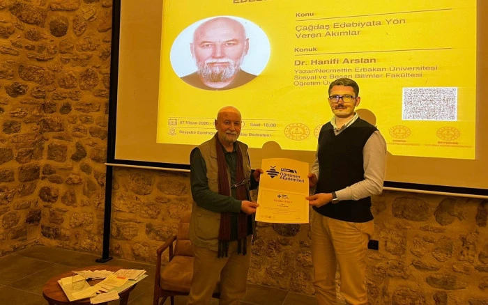 Programa konuşmacı olarak katılan Dr. Hanifi Arslan, çağdaş edebiyatın gelişim süreci, edebi akımların ortaya çıkışı ve günümüz edebiyatına etkileri üzerine kapsamlı bir sunum yaptı.